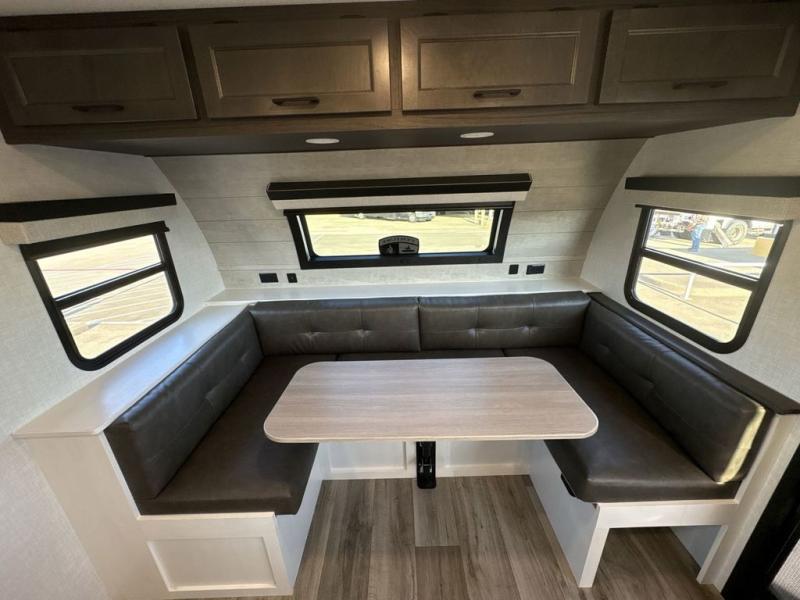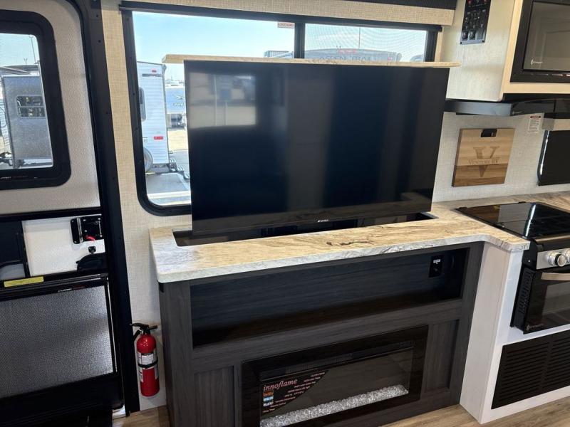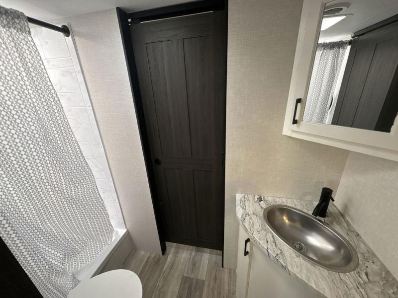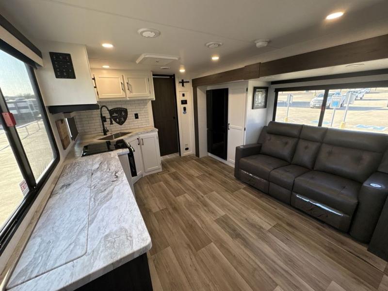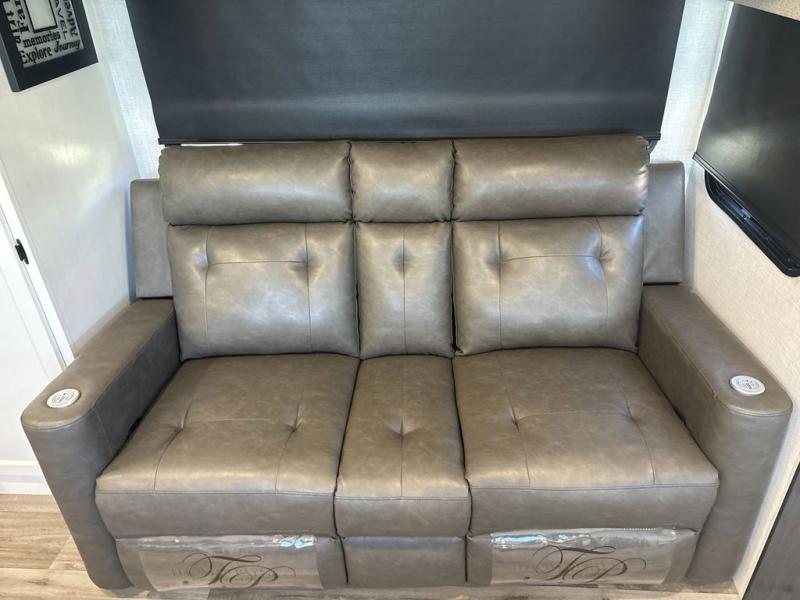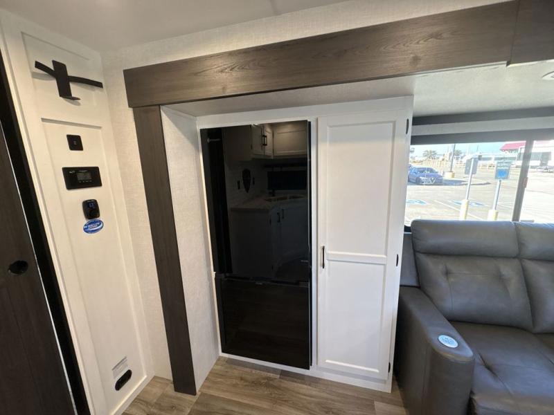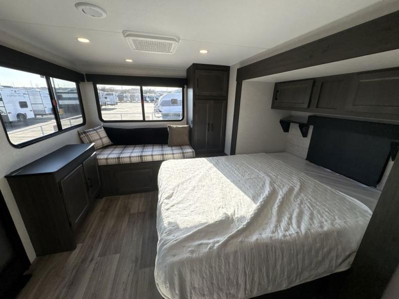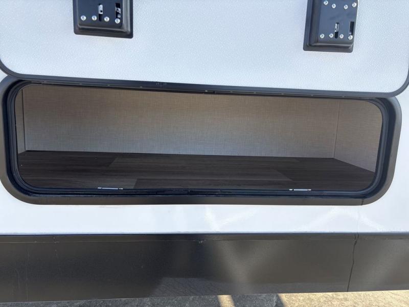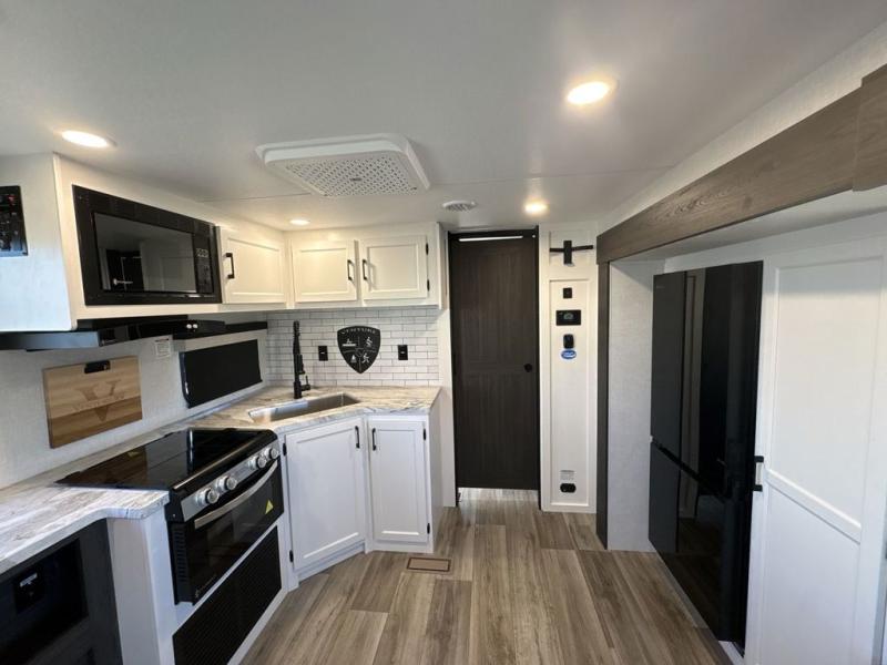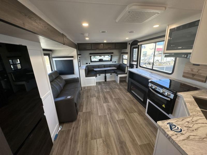 Step inside through one of the two entry doors and you’re welcomed into a thoughtfully designed living and dining area that blends comfort and functionality. At the front, a spacious 42" x 80" U-dinette with a swivel table offers plenty of room to enjoy meals, gather with friends, or play board games. In the slide-out, theater seating with built-in USB ports provides a cozy place to relax, it is next to the 10 cu. ft. refrigerator and pantry for easy access to groceries and dry goods. Across, the kitchen is equipped with essentials including a large stainless steel sink, three-burner cooktop, and ample overhead cabinetry for snacks and cookware. Unwind in the evening with the fireplace and 50" raise-and-lower TV, perfect for movie nights after a day of adventure. The walk-through bathroom features a 30" x 36" shower, making it easy to get ready for the day. At the rear, the bedroom offers a 60" x 80" Sleep Tight queen bed in a slide-out for extra walking space, along with a dresser and bench seat for added comfort. A second entry door in the bedroom provides convenient access for early mornings or quick trips outside.