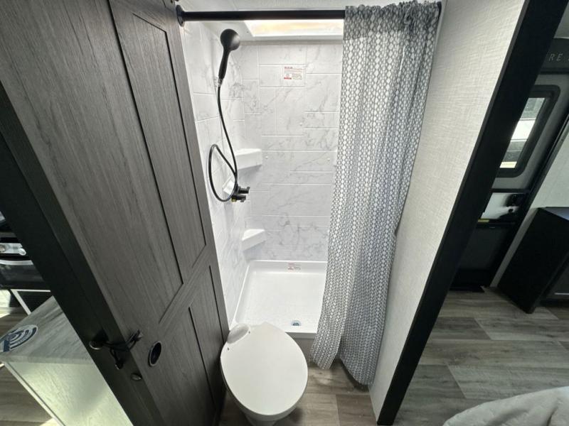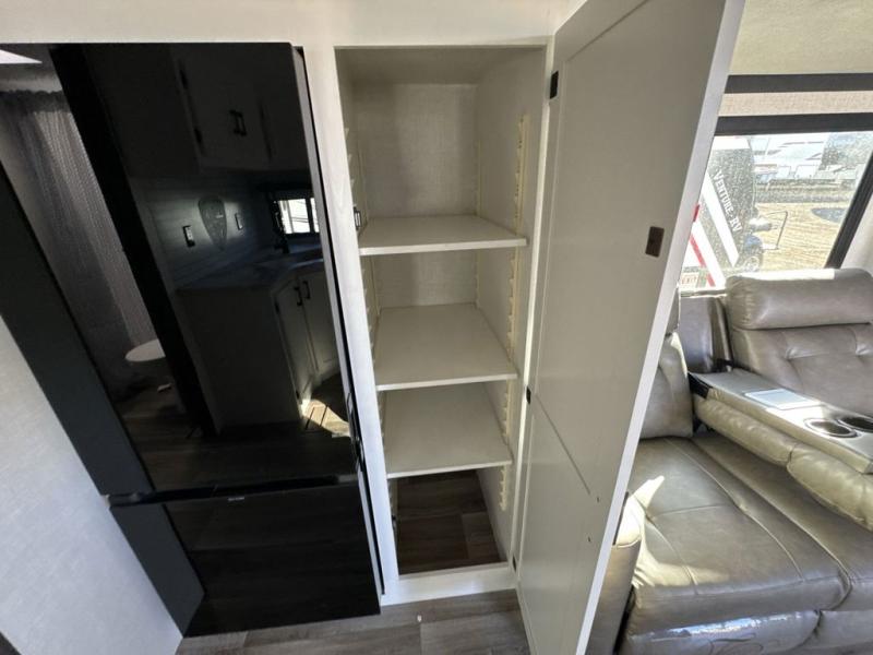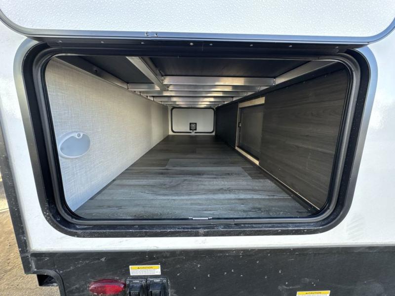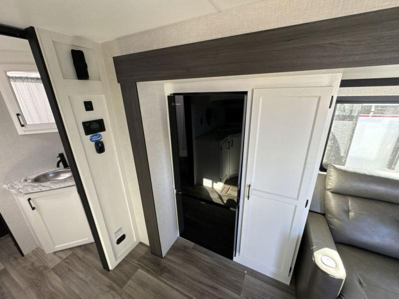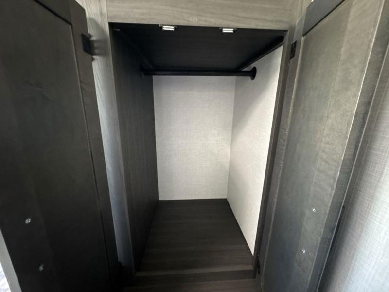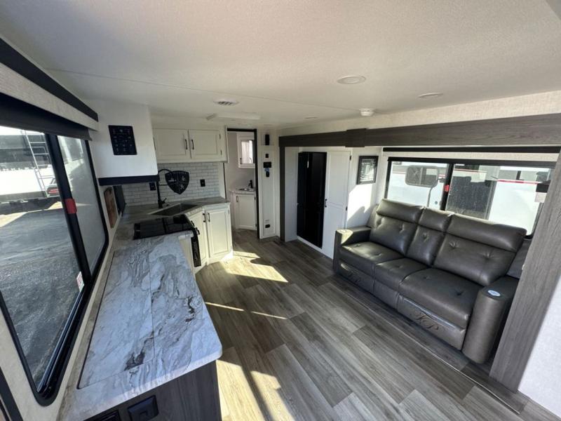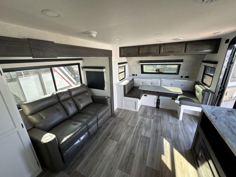 Step inside through one of the two entry doors and you’re welcomed into a thoughtfully designed living and dining area that blends comfort and functionality. At the front, a spacious 42" x 80" U-dinette with a swivel table offers plenty of room to enjoy meals, gather with friends, or play board games. In the slide-out, theater seating with built-in USB ports provides a cozy place to relax, it is next to the 10 cu. ft. refrigerator and pantry for easy access to groceries and dry goods. Across, the kitchen is equipped with essentials including a large stainless steel sink, three-burner cooktop, and ample overhead cabinetry for snacks and cookware. Unwind in the evening with the fireplace and 50" raise-and-lower TV, perfect for movie nights after a day of adventure. The walk-through bathroom features a 30" x 36" shower, making it easy to get ready for the day. At the rear, the bedroom offers a 60" x 80" Sleep Tight queen bed in a slide-out for extra walking space, along with a dresser and bench seat for added comfort. A second entry door in the bedroom provides convenient access for early mornings or quick trips outside.