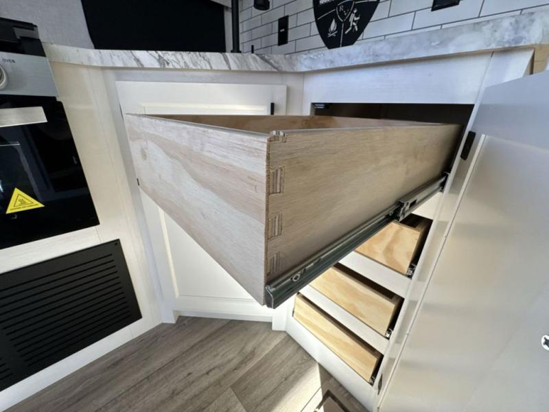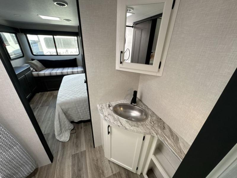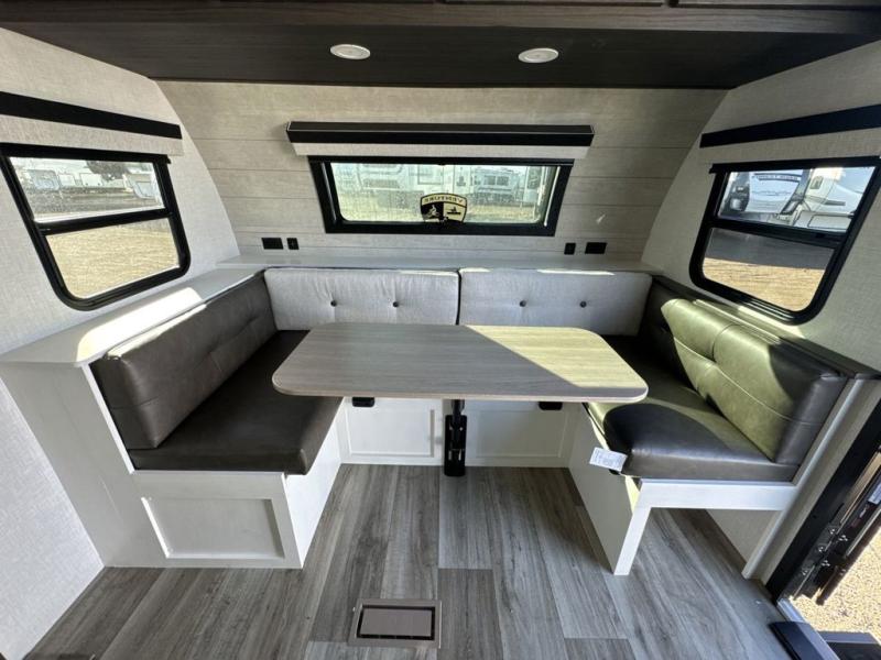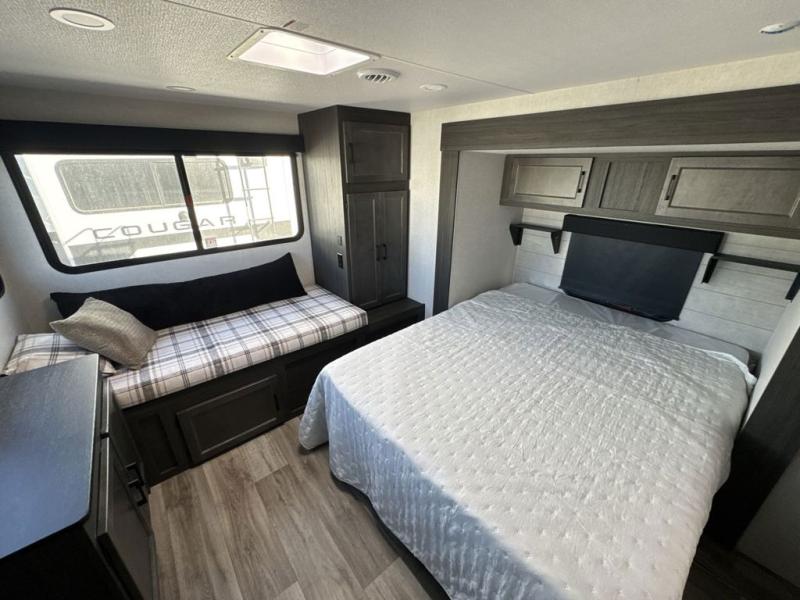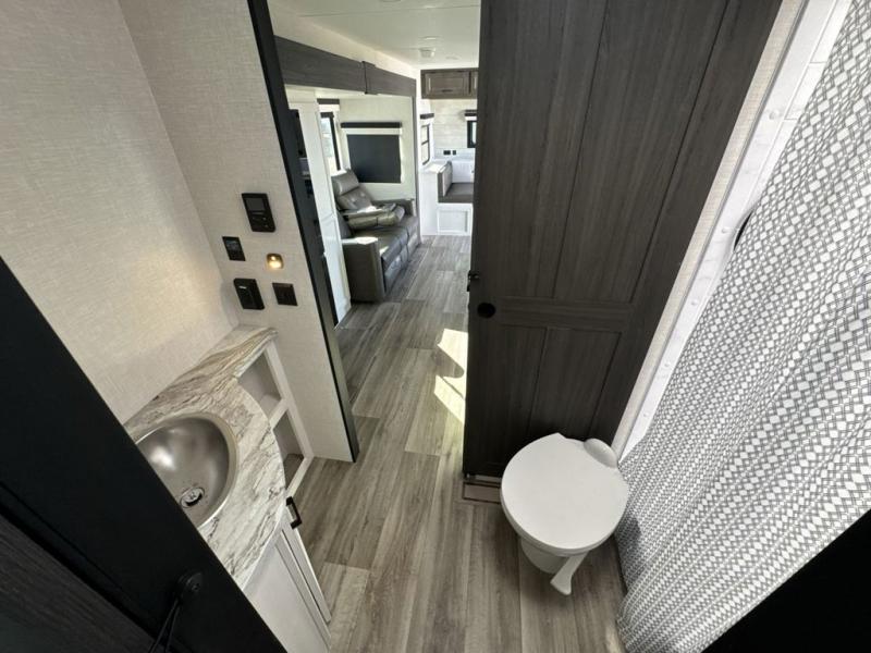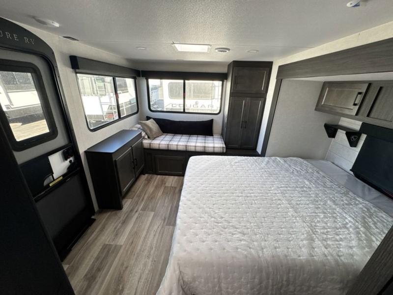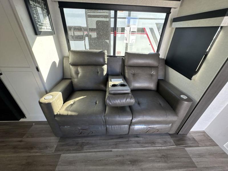 Step inside through one of the two entry doors and you’re welcomed into a thoughtfully designed living and dining area that blends comfort and functionality. At the front, a spacious 42" x 80" U-dinette with a swivel table offers plenty of room to enjoy meals, gather with friends, or play board games. In the slide-out, theater seating with built-in USB ports provides a cozy place to relax, it is next to the 10 cu. ft. refrigerator and pantry for easy access to groceries and dry goods. Across, the kitchen is equipped with essentials including a large stainless steel sink, three-burner cooktop, and ample overhead cabinetry for snacks and cookware. Unwind in the evening with the fireplace and 50" raise-and-lower TV, perfect for movie nights after a day of adventure. The walk-through bathroom features a 30" x 36" shower, making it easy to get ready for the day. At the rear, the bedroom offers a 60" x 80" Sleep Tight queen bed in a slide-out for extra walking space, along with a dresser and bench seat for added comfort. A second entry door in the bedroom provides convenient access for early mornings or quick trips outside.