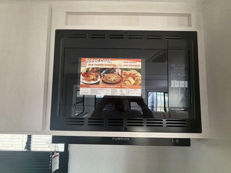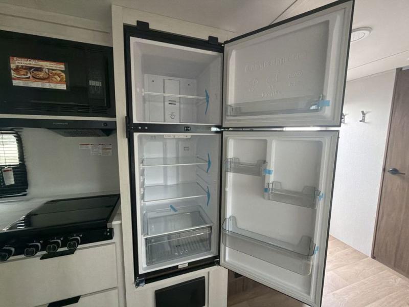 You'll feel right at home when you camp in this travel trailer! The large slide out gives you plenty of space to relax on the theater seating, play games at the booth dinette, and cook in the full kitchen. An adult or two little ones can sleep on the booth dinette at night, and if you're needing additional sleeping space, just choose the optional tri-fold sofa in place of the theater seating. You'll appreciate having the front private bedroom all to yourselves, complete with an Olympic queen bed, dual bedside wardrobes, and underbed storage. And don't overlook the full bath conveniently tucked in the back of the unit for added privacy!