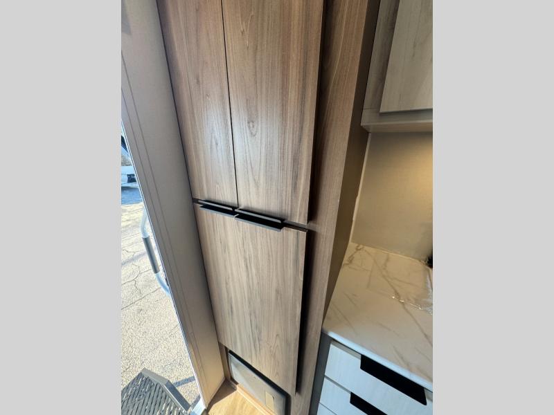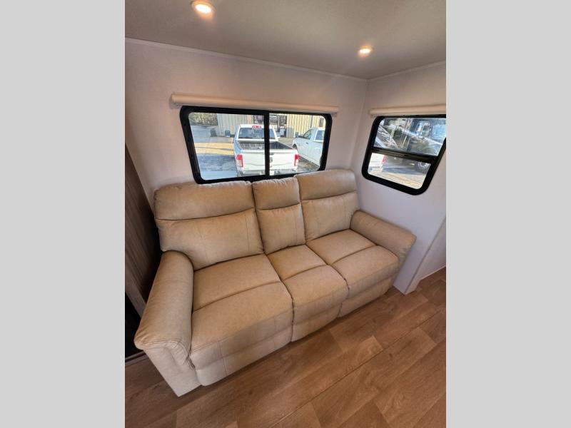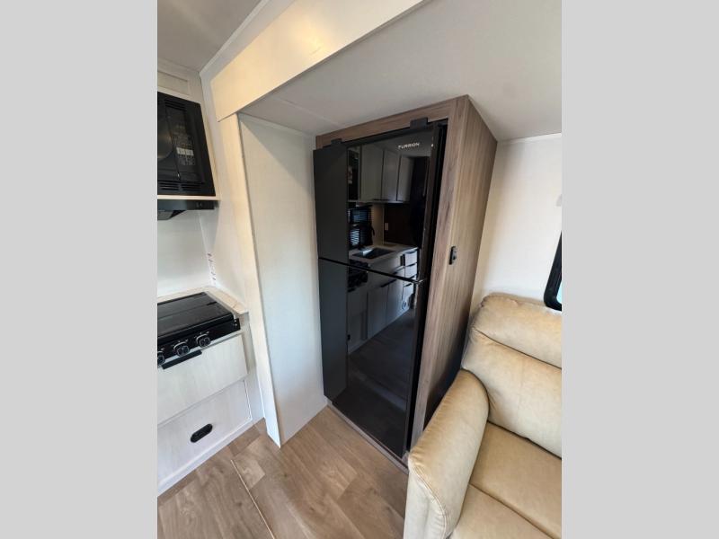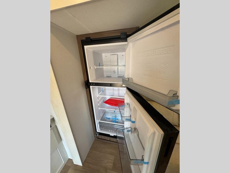 You'll love every minute spent in this spacious travel trailer! With dual entry doors, you can enter in through the rear kitchen or the front private bedroom! There are dual beside wardrobes here and a closet so you can keep your space organized, and the full bath is right next to the bedroom for easy nighttime use. Back to the kitchen, you'll find ample counter space to prep meals, a three-burner cooktop, plus a pantry and 10 cu. ft. 12V refrigerator for food storage. Your crew can dine at the booth dinette, then relax on the tri-fold sofa slide after dinner. And both of these pieces of furniture can double as sleeping space for guests!