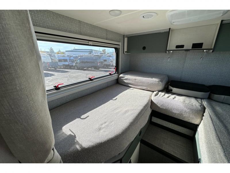 This EKKO all-wheel drive Class C gas motorhome is just unbelievably functional! Not only do you have plenty of storage space for all of your gear with the gear garage, under-bed storage, pantry, and 5.3-cubic foot refrigerator, but you also have a 24" x 30" wet bath with a pivoting lavatory wall so you can stay clean without having to stop at rest areas along the way. The cab area is excellently appointed with a radio/rearview monitor system, swivel/recline cab seats, and many driving safety features. Since the cab seats can swivel, you can use them as another place to sit down and eat at the fold-down table, and you can also use the swivel/adjustable work table for the passenger cab seat or as an extended countertop in the kitchen. Above the dining area is an access point to the optional pop-top sleeping area which would come in handy if you travel with multiple people.