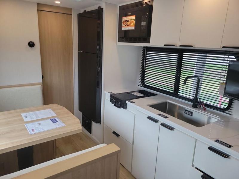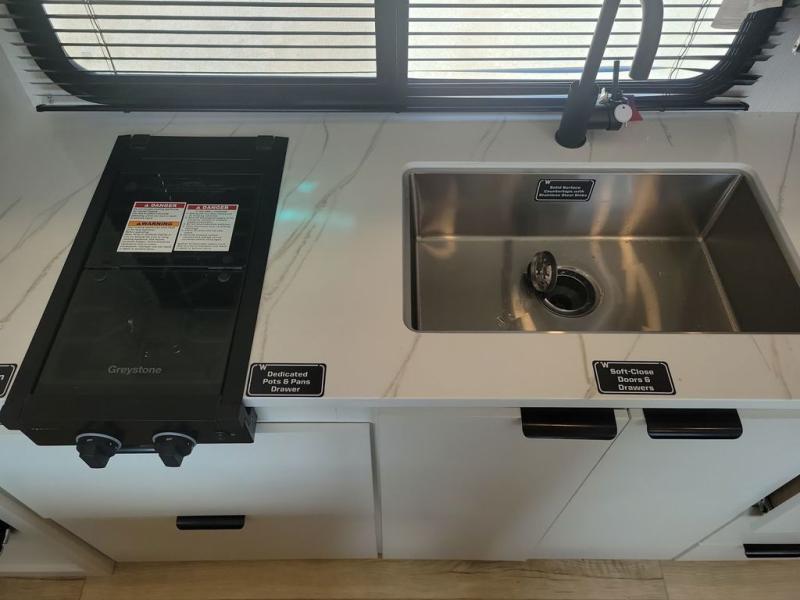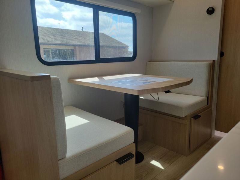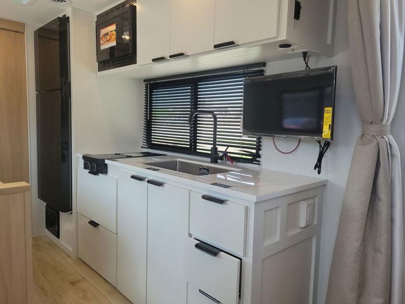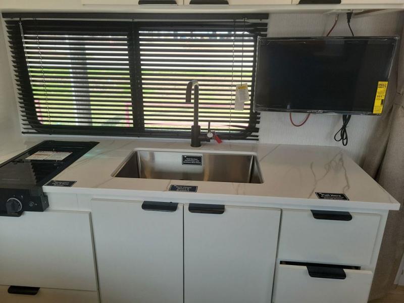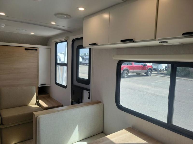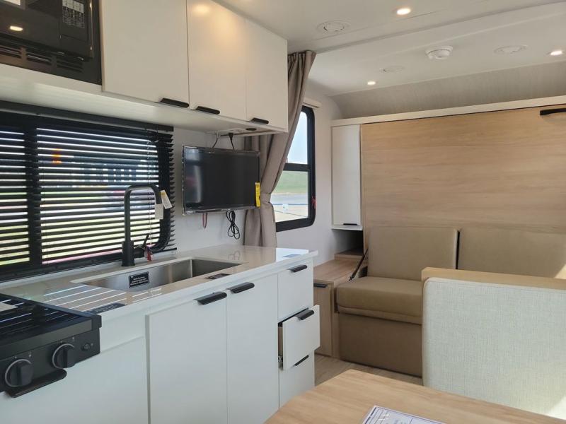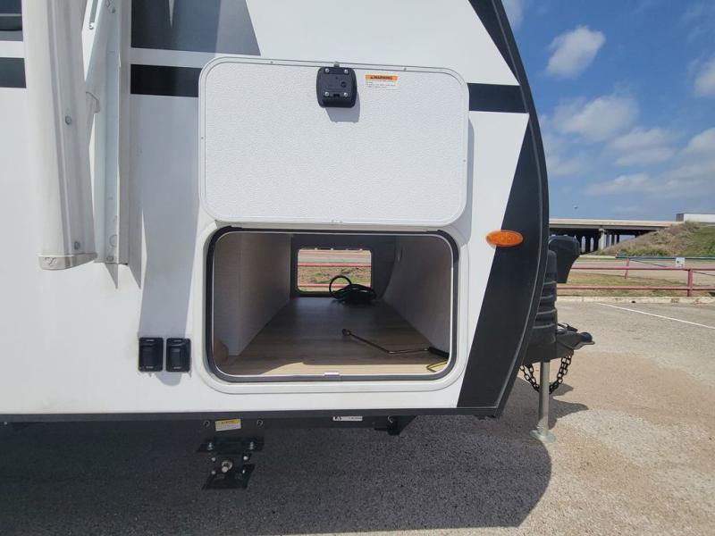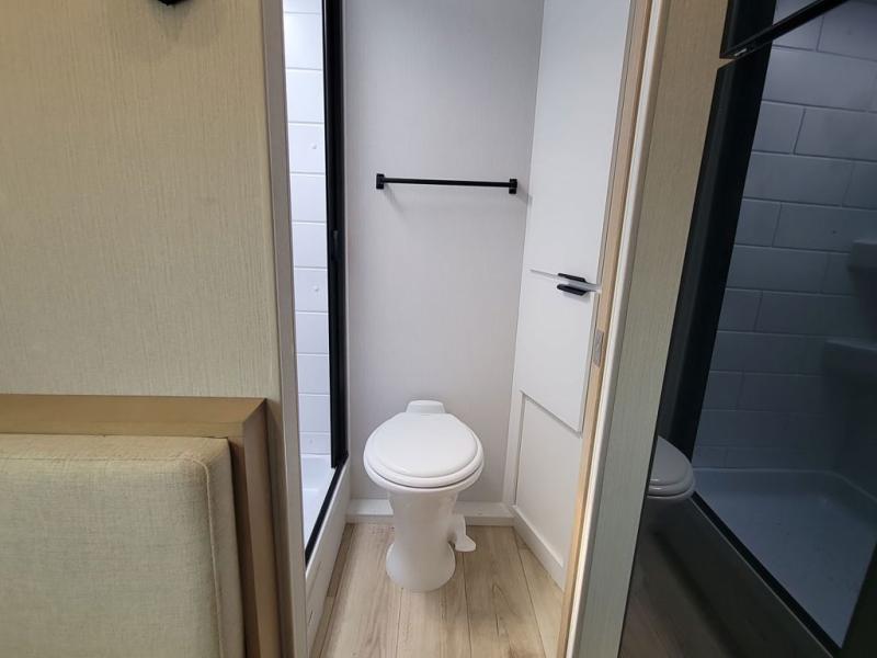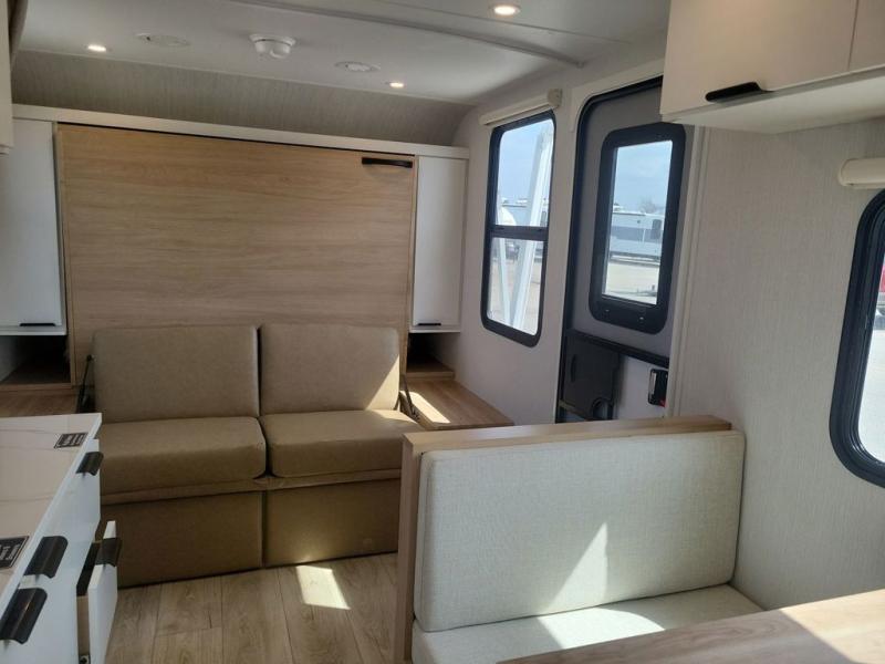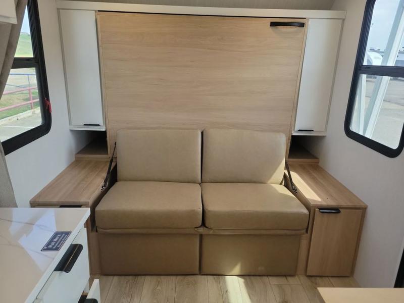 You'll love camping in this travel trailer with front Murphy bed that will provide versatile seating and sleeping space. You can whip up your best meals on the two-burner cooktop or in the convection microwave, and there is a 10-cu. ft. 12V refrigerator to keep your food fresh. You can dine at the booth dinette, play a game of cards after dinner, and convert to sleeping space for guests. A full rear bath will let you clean up after a day outdoors, and you'll appreciate the bath wardrobe/linen closet to keep clean towels and clothes close by!