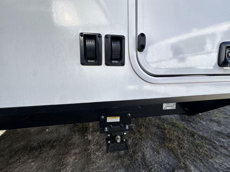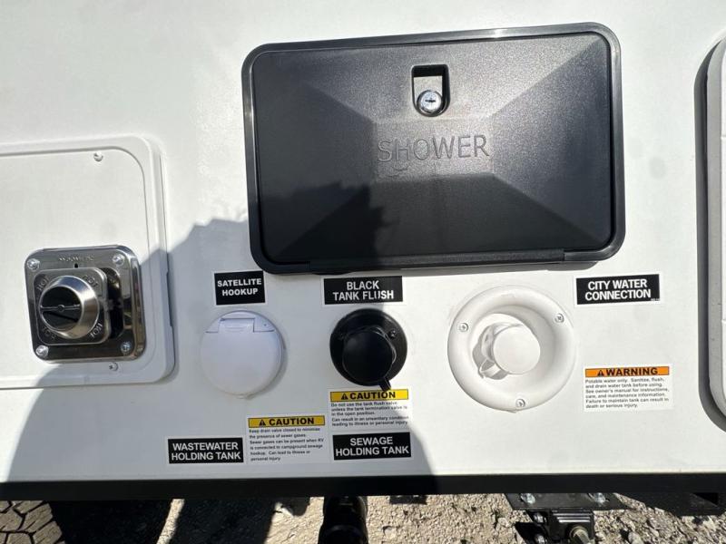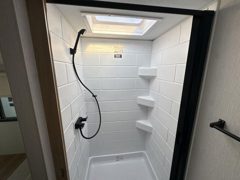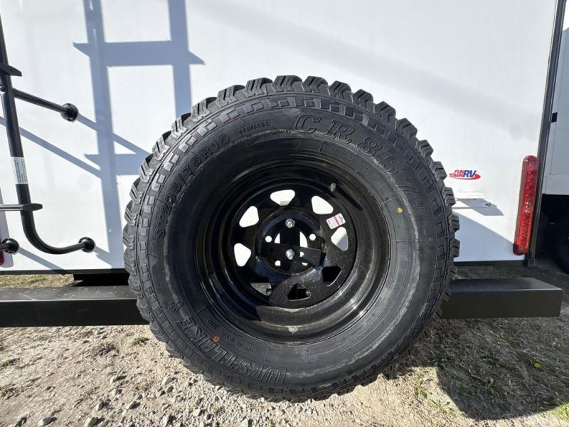 You'll love camping in this travel trailer with front twin beds and a divider curtain if you have a guest sleeping over on the booth dinette. You can whip up your best meals on the two-burner cooktop or in the convection microwave, and there is a 10-cu. ft. 12V refrigerator to keep your food fresh. A full rear bath will let you clean up after a day outdoors, and you'll appreciate the bath wardrobe/linen closet to keep clean towels and clothes close by!