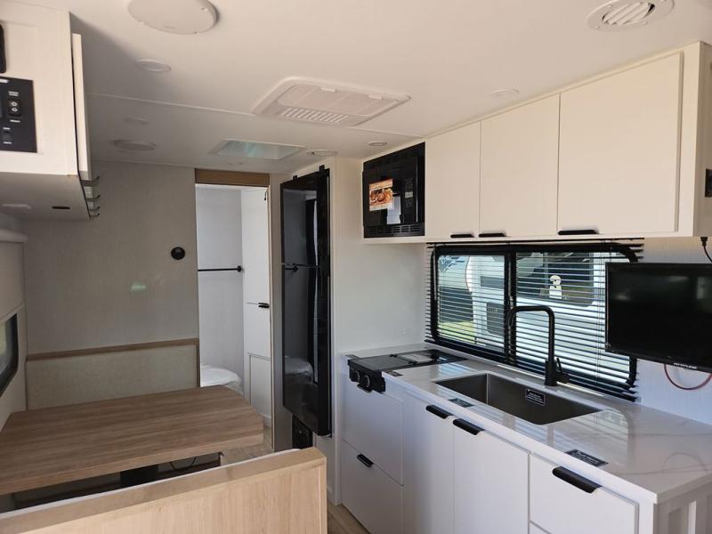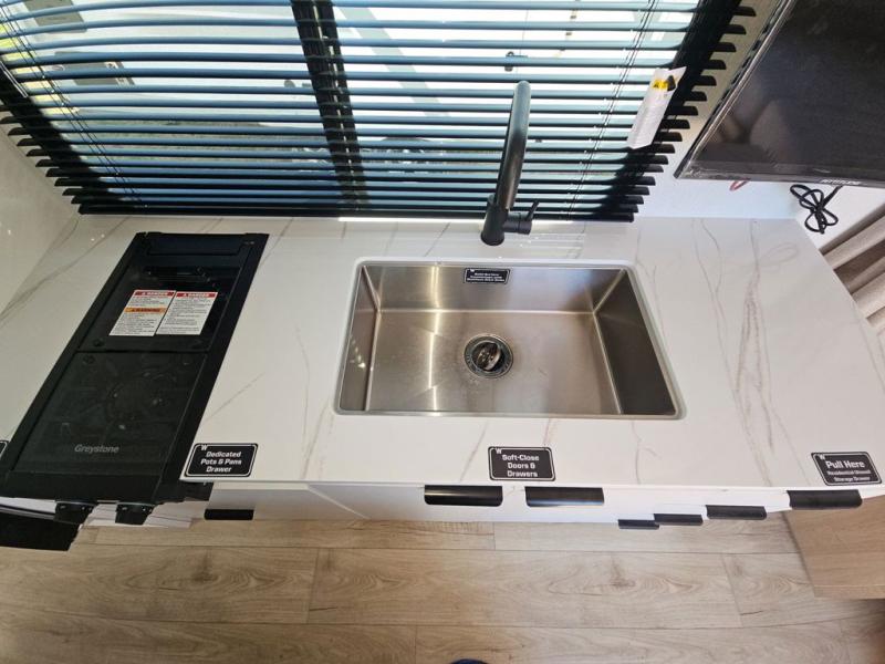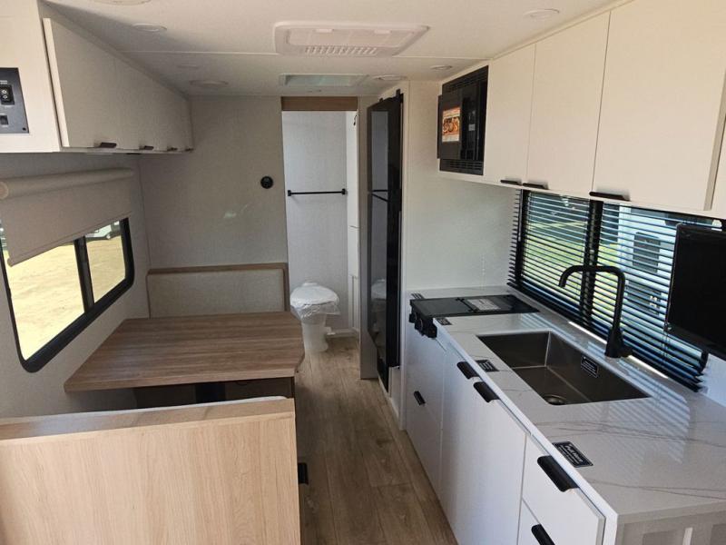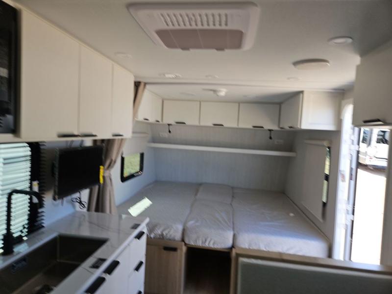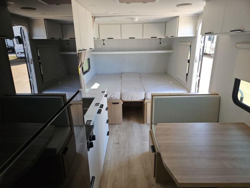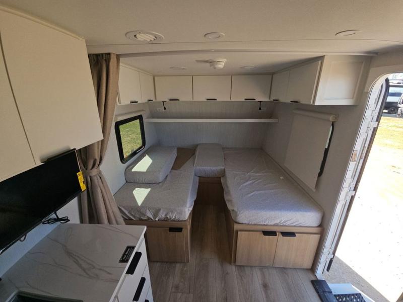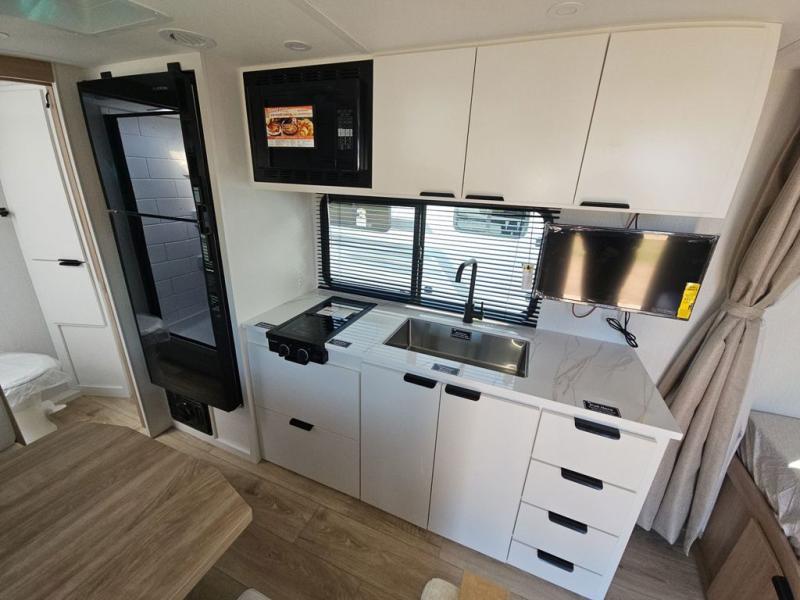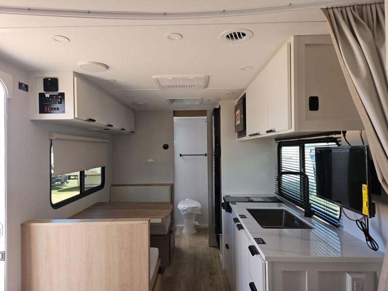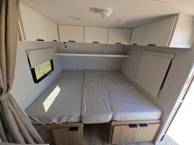 You'll love camping in this travel trailer with front twin beds and a divider curtain if you have a guest sleeping over on the booth dinette. You can whip up your best meals on the two-burner cooktop or in the convection microwave, and there is a 10-cu. ft. 12V refrigerator to keep your food fresh. A full rear bath will let you clean up after a day outdoors, and you'll appreciate the bath wardrobe/linen closet to keep clean towels and clothes close by!