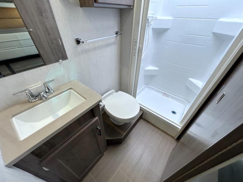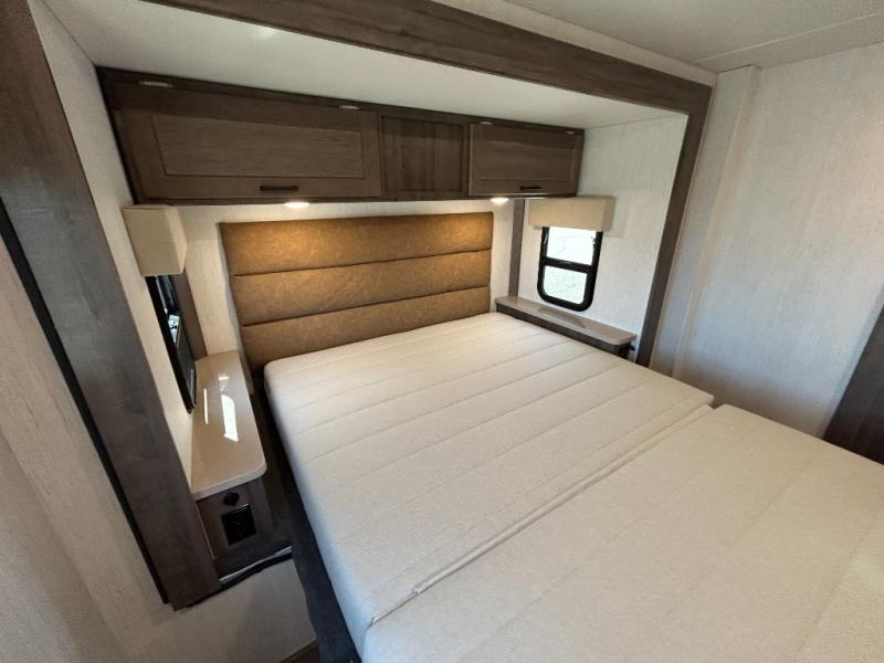 Time spent in this spacious coach will be time well spent! Whether you're dining around the U-shaped dinette, relaxing on the sofa bed, or visiting outdoors under the power awning, you're sure to have a great time. The cab-over bunk and the living room furniture will provide sleeping space for guests, and if don't have a lot of overnight guests, just choose the optional theater seating in place of the sofa bed. A three burner range and a microwave oven will let you prepare your best meals while you're on the road, plus there is an 8 cu. ft. 2-way large double door refrigerator/freezer and pantry for food storage. After a long day outdoors exploring trails, you can relax in the private bedroom on the RV queen bed slide. There are dual bedside nightstands for your things, a sliding door for more space, plus quick access into the rear corner full bath!
