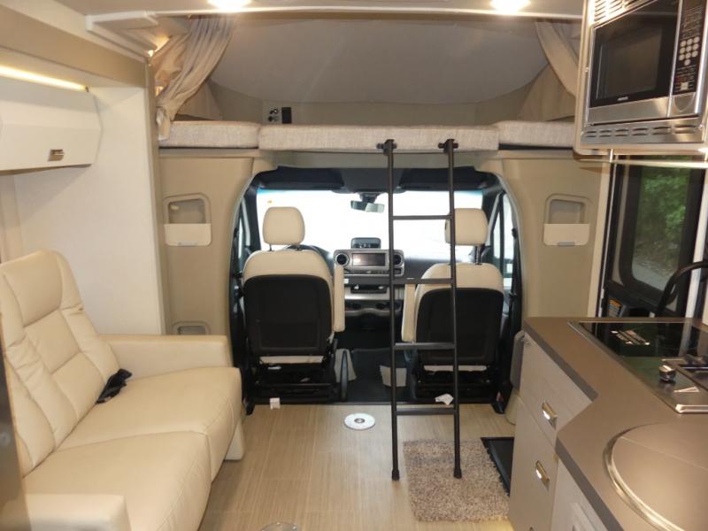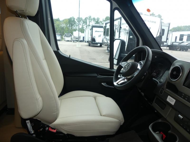 The Winnebago Navion 24T and 24R Class C diesel motorhomes are functional, innovative, and stylish! You can rule the interstate with the Mercedes-Benz RWD Sprinter chassis, or choose the optional Mercedes-Benz AWD Sprinter chassis to tackle tougher terrain. A Lithium Power Package comes with a 320-amp-hour lithium battery and a dedicated second alternator that will allow you to charge the batteries faster while you're on the road. There are also two 120-watt solar panels to keep you going when you're off-grid. Since there is a heated gear garage with L-track cargo tie-downs, you can bring along two full-size bikes and additional gear for hiking, plus there are 110V/12V charging ports and LED lighting here for added convenience. The contemporary interior features blackout roller shades for the lounge and dining area, woven vinyl flooring throughout, and dimmable LED lighting. There is also a Winnebago Connect that is integrated into your Winnebago app that acts as your RV companion. Now you can stay informed on vehicle system alerts, travel prep resources, energy management, and more!