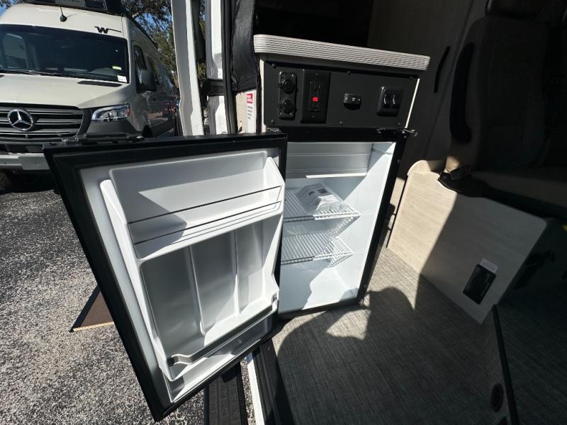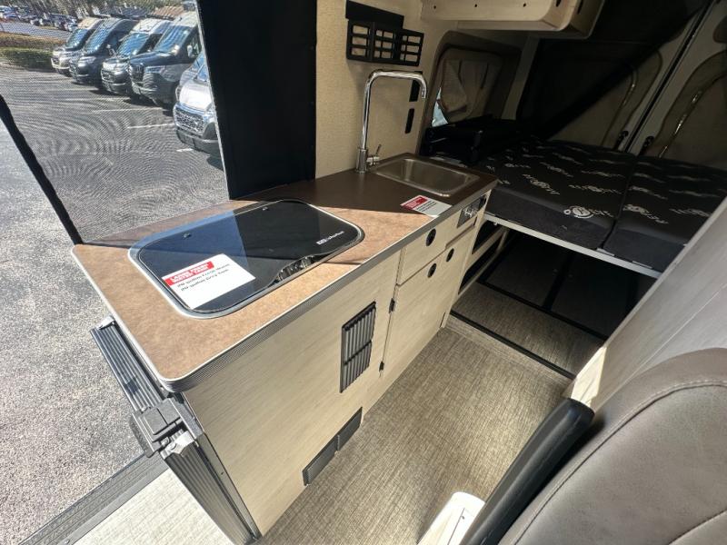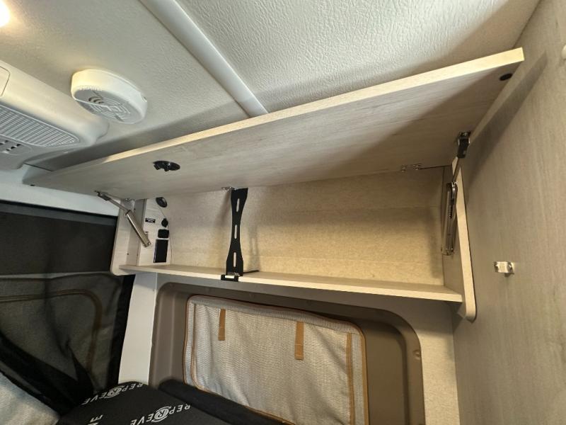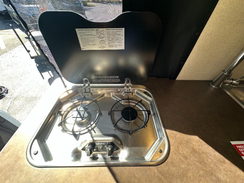 Enjoy a weekend ride in the mountains or make it an overnight stay with versatile sleeping options in this camper van. You'll find the Murphy+ bed in the back will provide a great night's rest, or you can choose the optional sofa/bed with added belted seating if you have more tag-alongs. And of course the little ones will love the pop-top sleeping area to climb into each night. After you've freshened up in the convenient wet bath, prepare breakfast on the two burner range, and the milk and eggs can go back in the 3.0 cu. ft. single door refrigerator/freezer. This model also includes rear double doors with screens to let the breeze in and keep bugs out!
