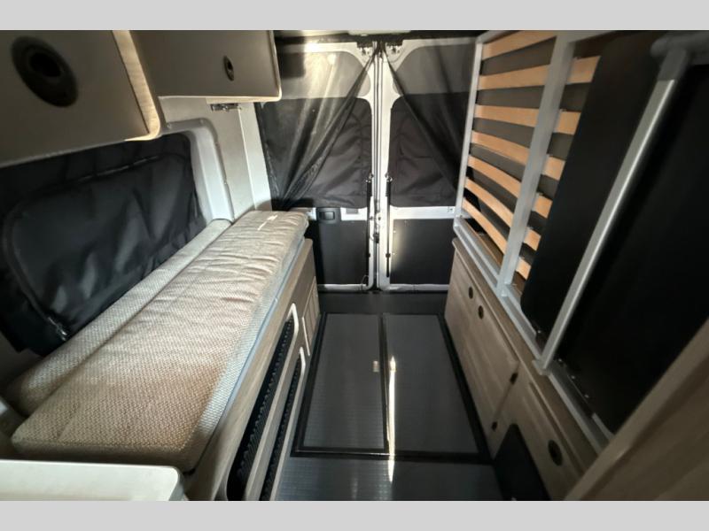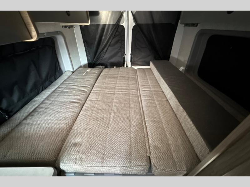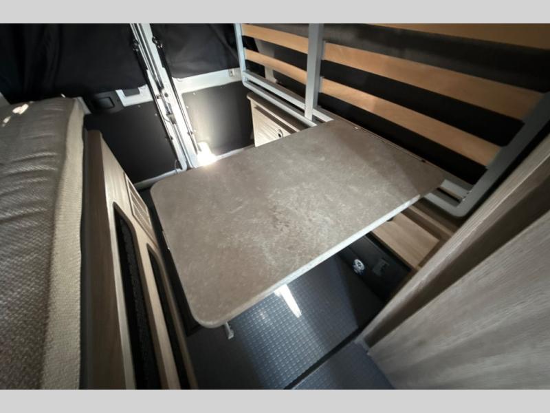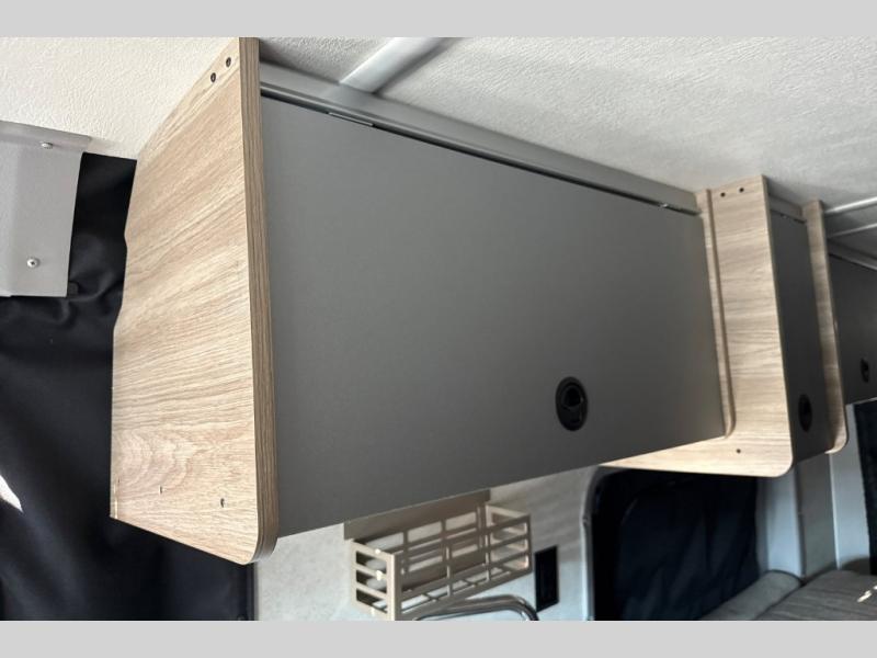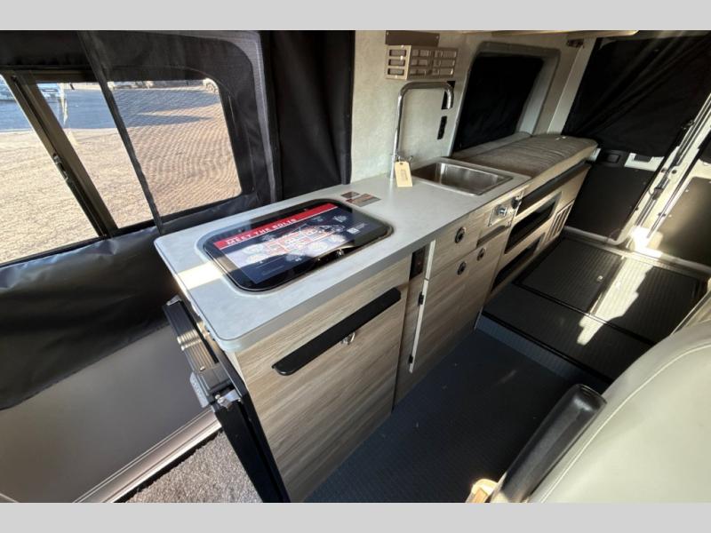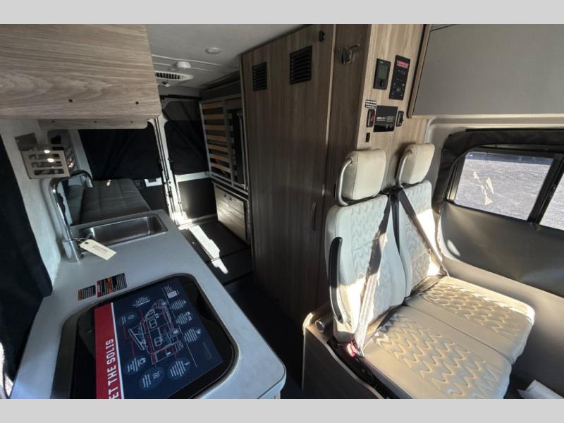 This camper van with an L-track storage system is perfect for those needing more storage space for their hiking and biking gear. You can stay powered up with the 2,800-watt gas generator, and there is a 13,500 BTU air conditioner with directional ducts and dial control that will allow you to come inside to cool off after a trail ride. A Murphy+ bed comes standard, and any guests that tag along can sleep in the pop-top sleeping area! If you choose to remove the pop-top, you'll enjoy the deluxe powered ventilator fan instead. You'll find the wet bath to come in handy when you want to clean up, and the dinette seating with a removable pedestal table will provide a place to enjoy your dinner at.