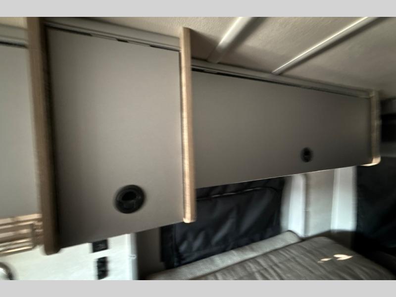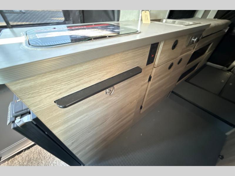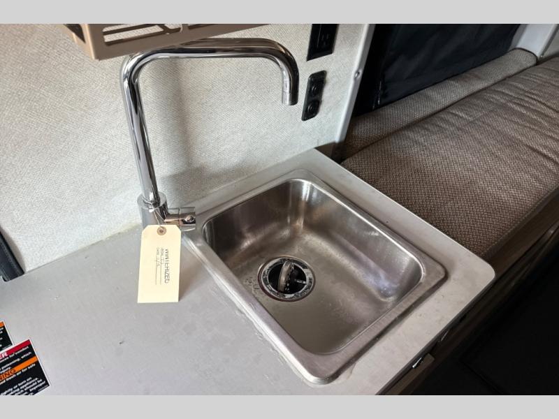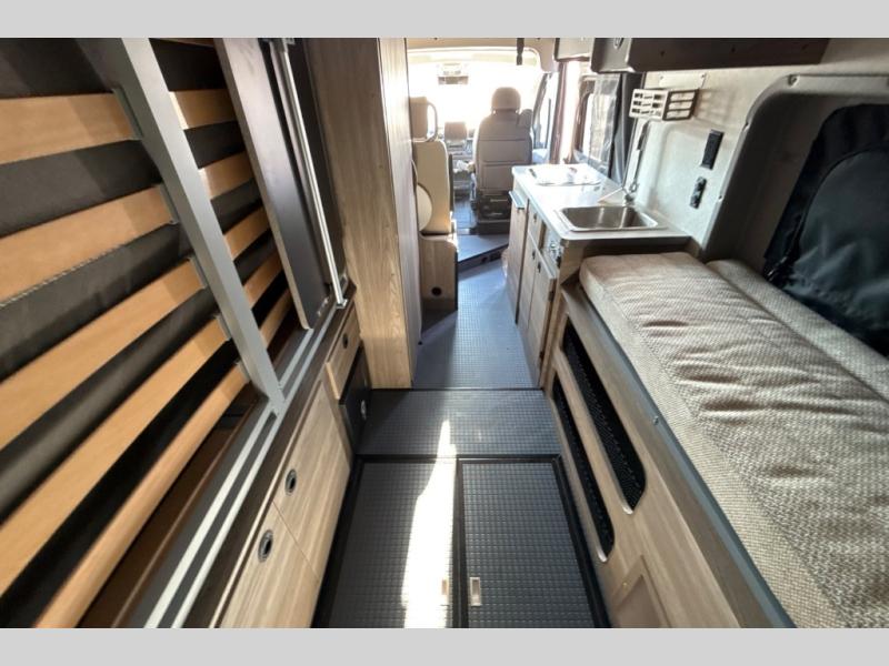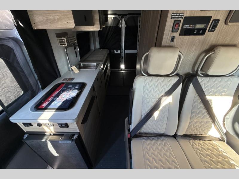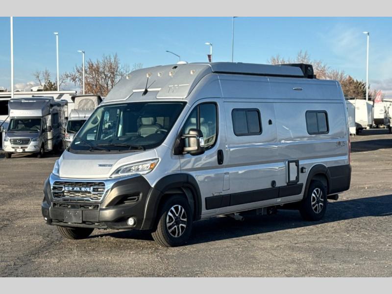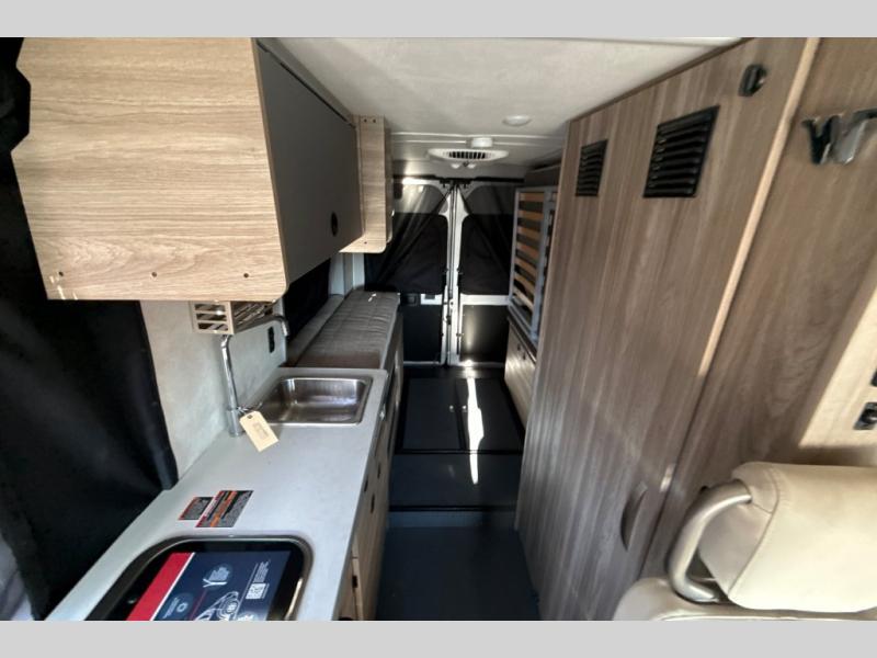 This camper van with an L-track storage system is perfect for those needing more storage space for their hiking and biking gear. You can stay powered up with the 2,800-watt gas generator, and there is a 13,500 BTU air conditioner with directional ducts and dial control that will allow you to come inside to cool off after a trail ride. A Murphy+ bed comes standard, and any guests that tag along can sleep in the pop-top sleeping area! If you choose to remove the pop-top, you'll enjoy the deluxe powered ventilator fan instead. You'll find the wet bath to come in handy when you want to clean up, and the dinette seating with a removable pedestal table will provide a place to enjoy your dinner at.