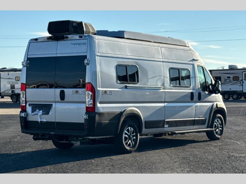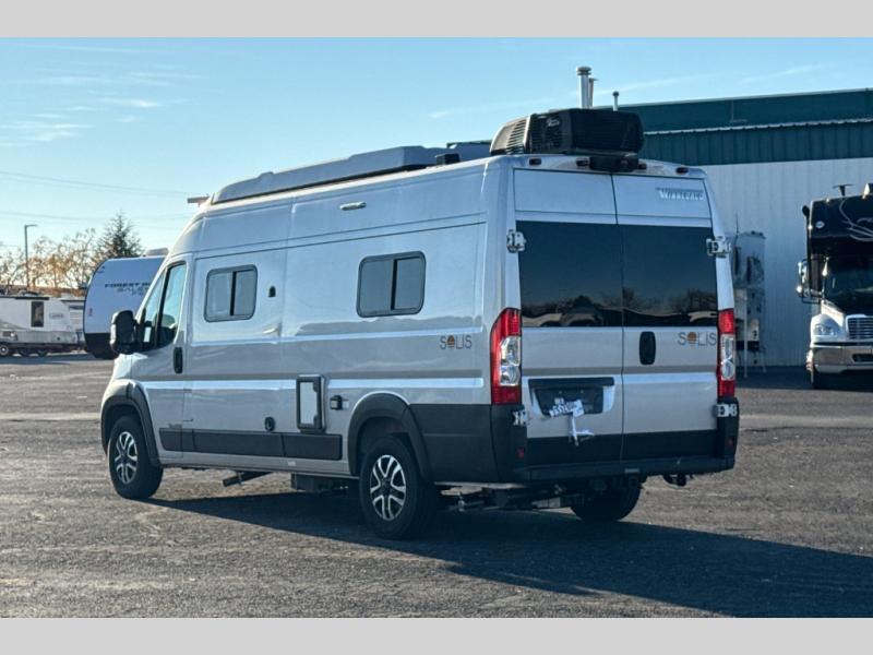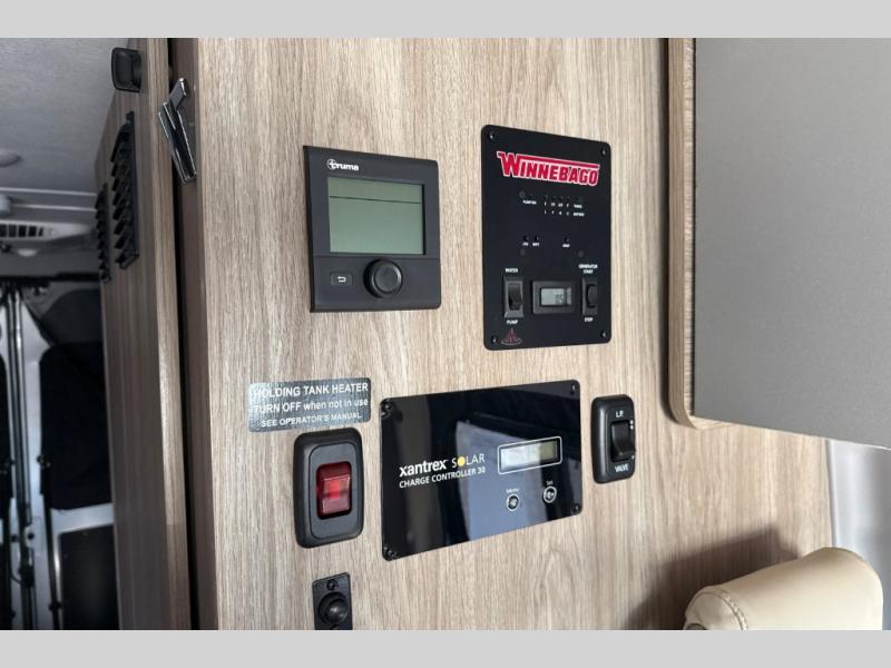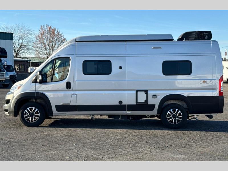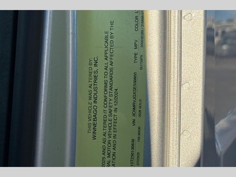 Each Solis Class B gas motorhome by Winnebago sits upon a fuel-efficient Ram ProMaster chassis with a 3.6L V6 engine to power your adventures. You will love the cab conveniences that make each trip enjoyable, like the radio/review monitor system touchscreen and the crosswind assist to keep you steady on the road. Some of the hassle-free amenities you will appreciate are the exterior wash station, the Eco-Hot water system, and the water center control panel located inside the right rear door. Head indoors to find heavy-duty vinyl flooring throughout, a laminate countertop and a stainless steel sink in the galley, plus tinted coach windows for added privacy. The Solis also features off-grid capabilities with its two deep-cycle Group 31 batteries and 220-watt flexible surface solar panel with a controller. Adventures awaits in the Solis Class B gas motorhome!