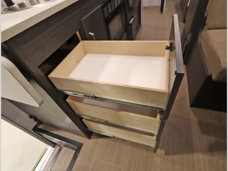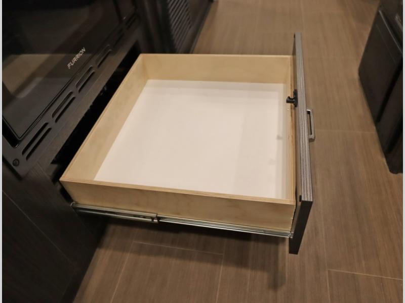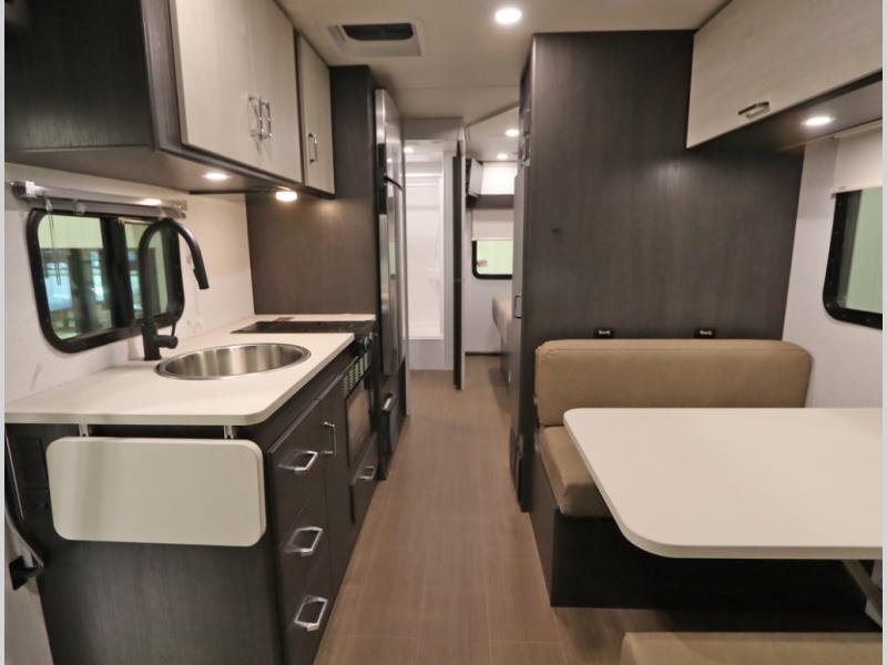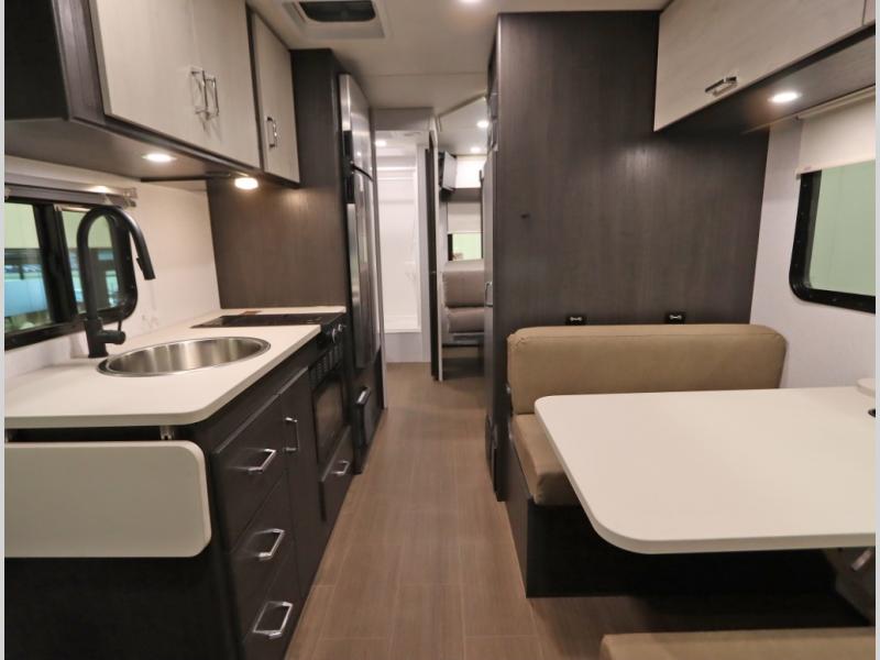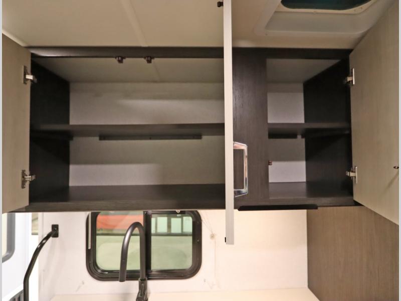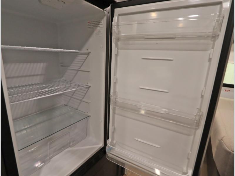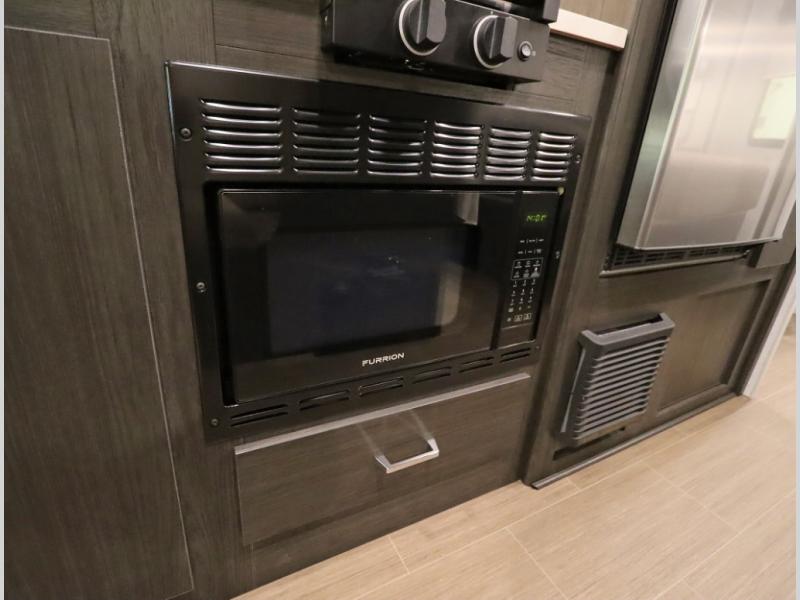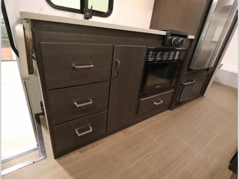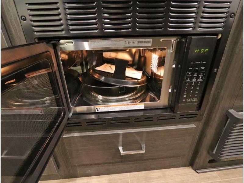 Convenient Amenities: The convection microwave with a built-in air fryer saves space, while flat floor designs enhance movement throughout the coach.
