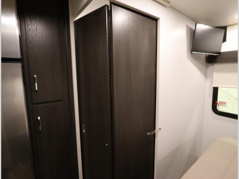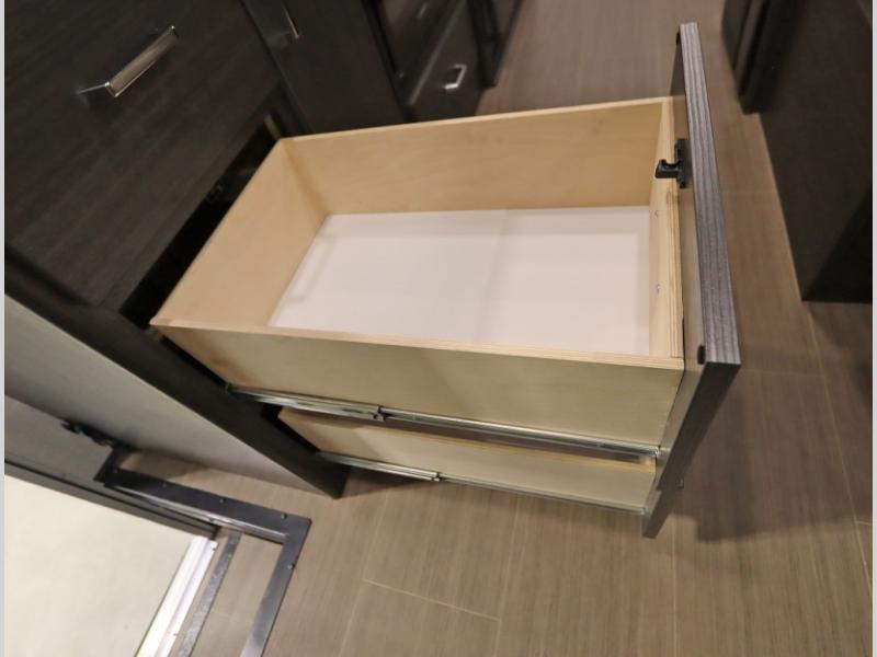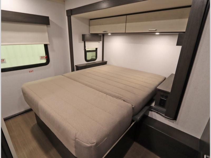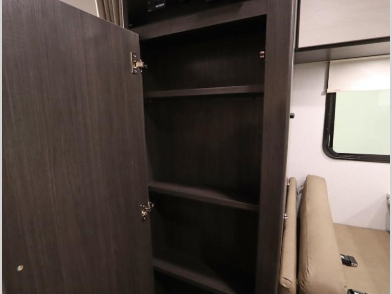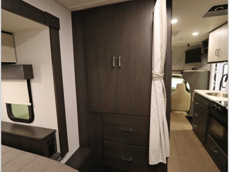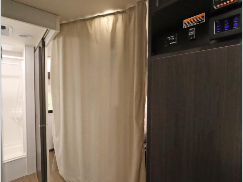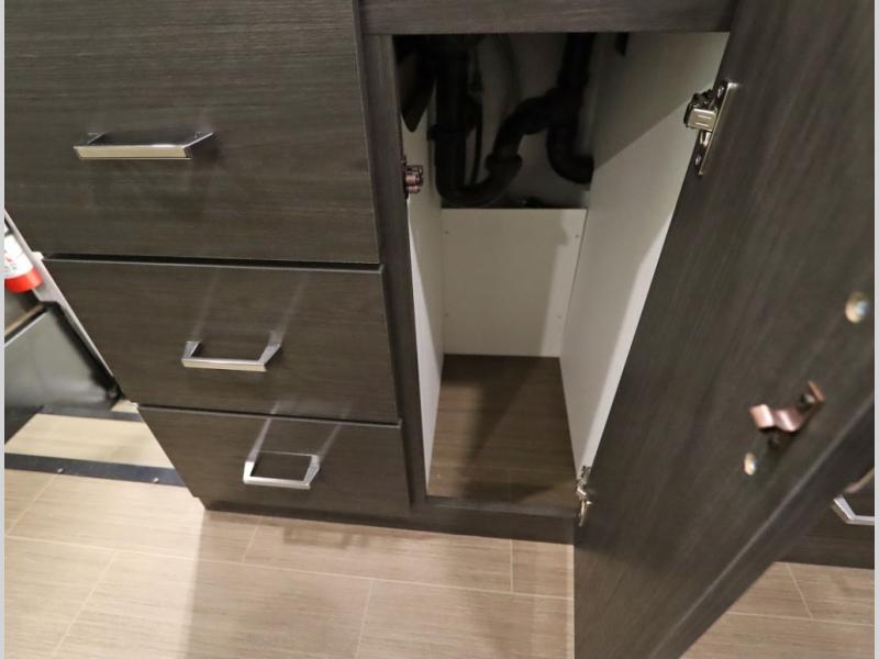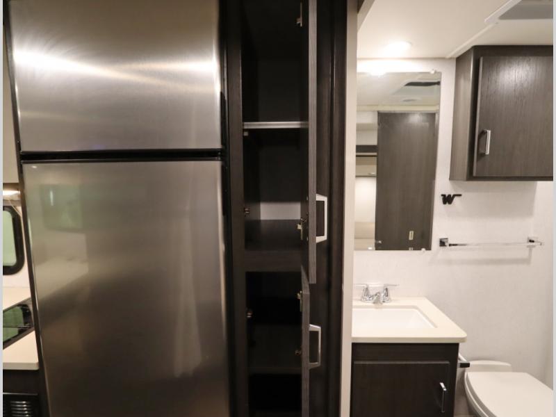 Convenient Amenities: The convection microwave with a built-in air fryer saves space, while flat floor designs enhance movement throughout the coach.