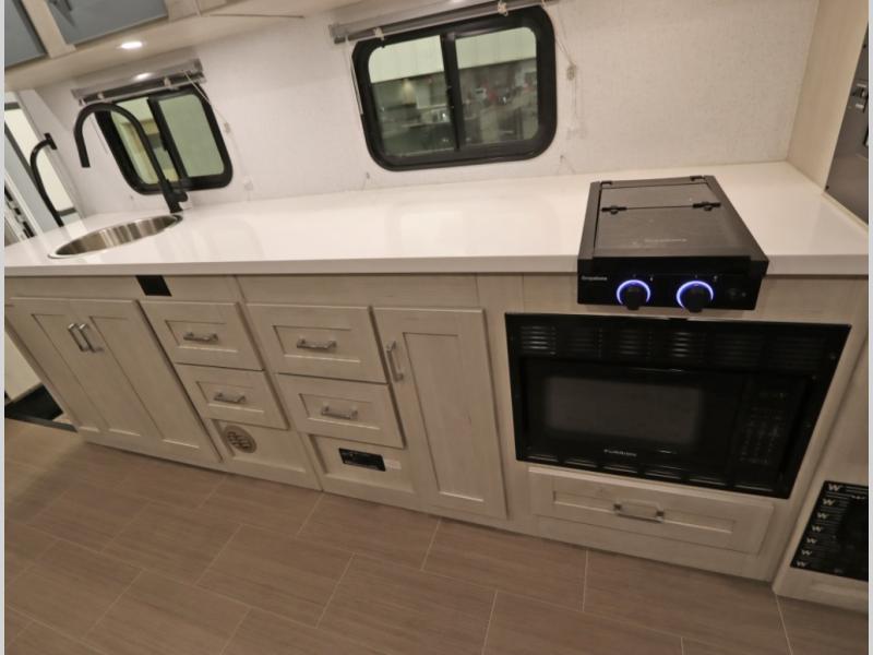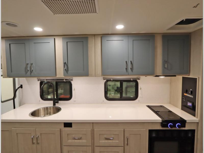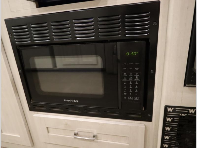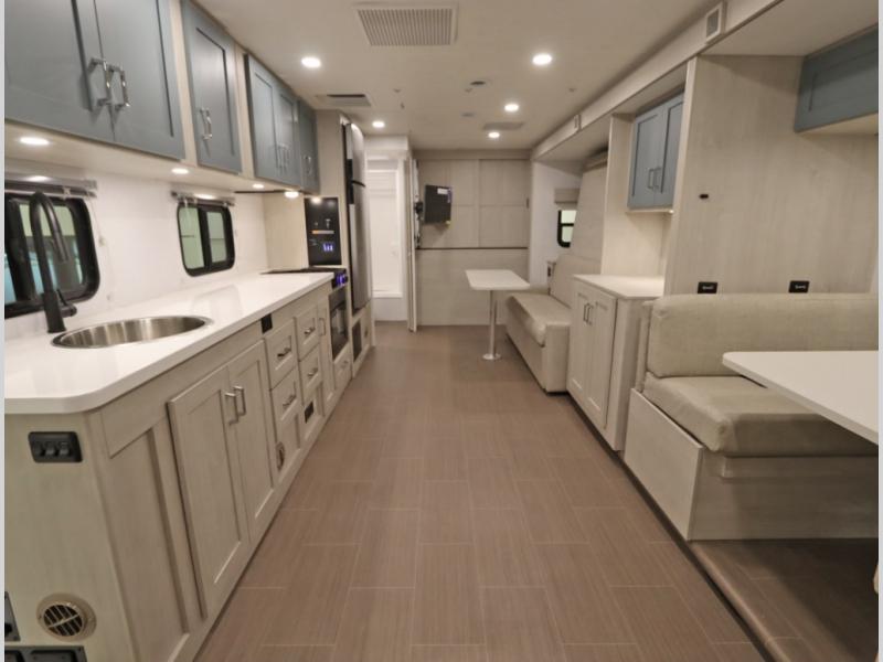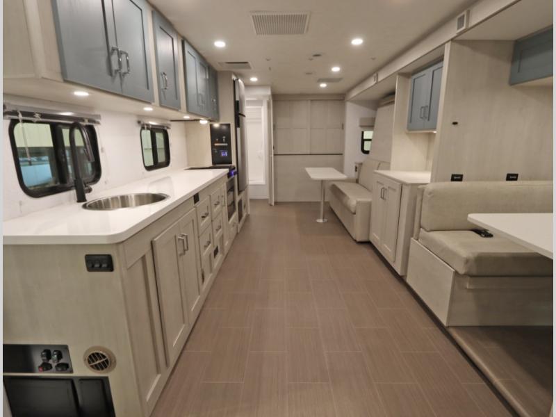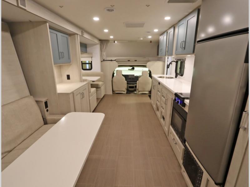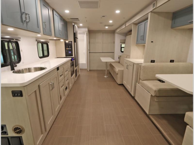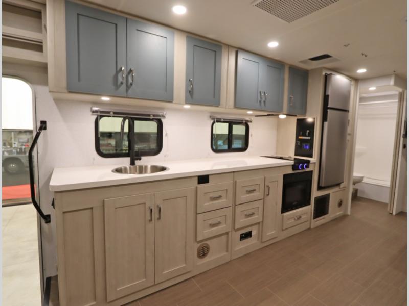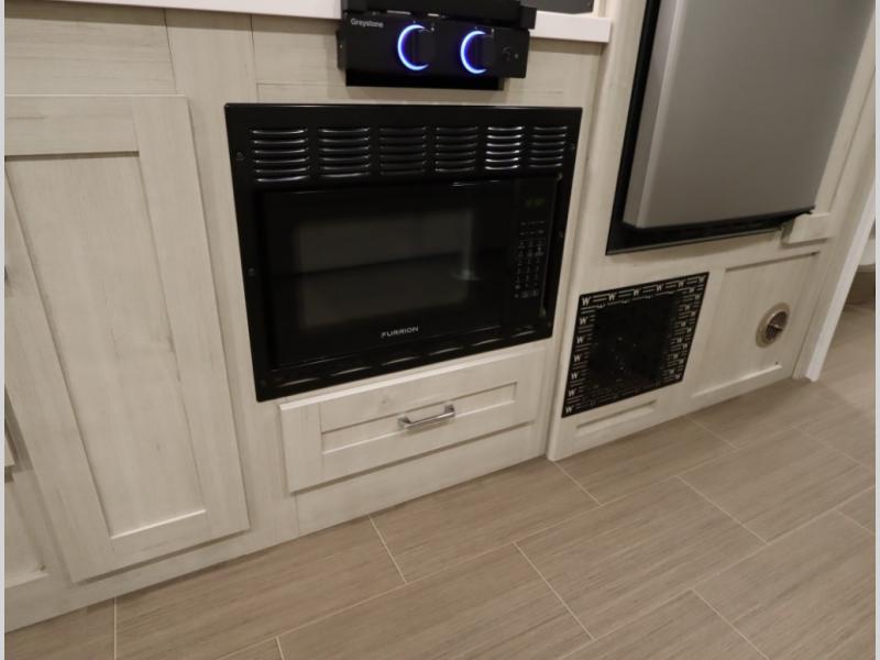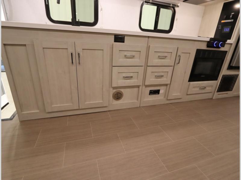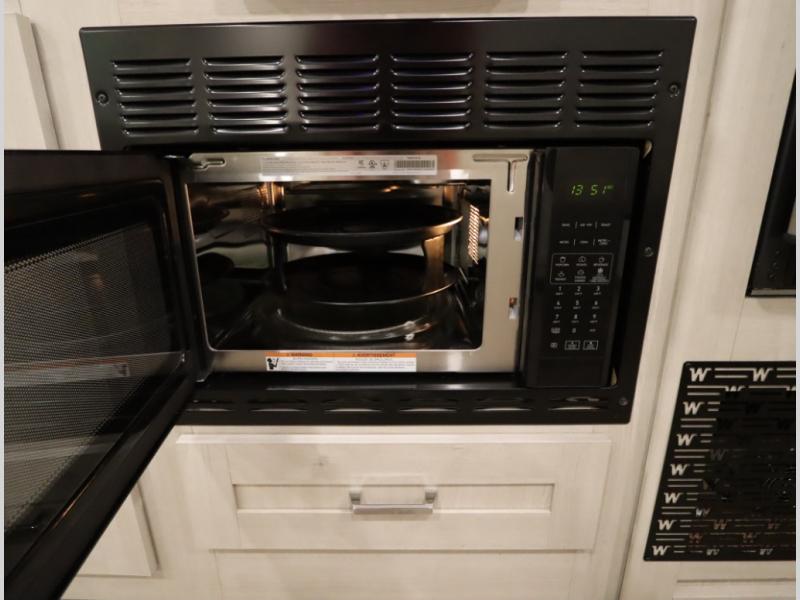 Convenient Amenities: The convection microwave with a built-in air fryer saves space, while flat floor designs enhance movement throughout the coach.
