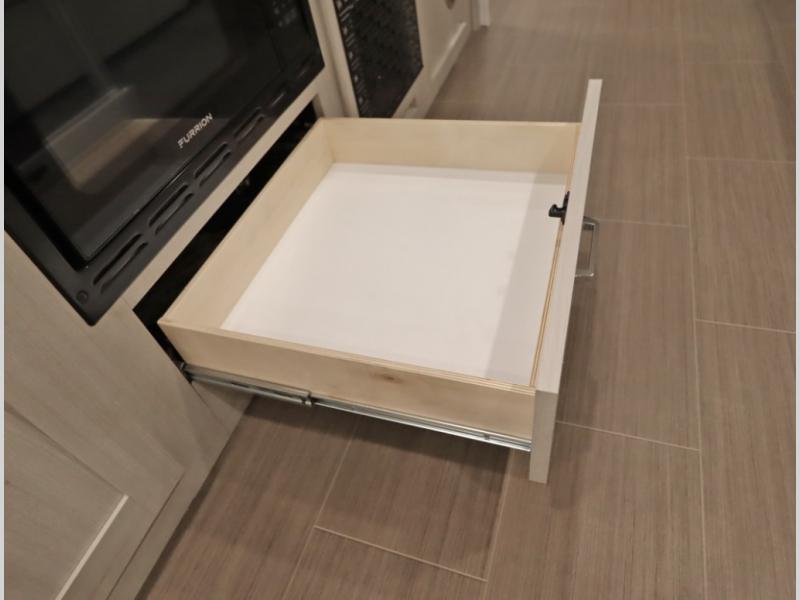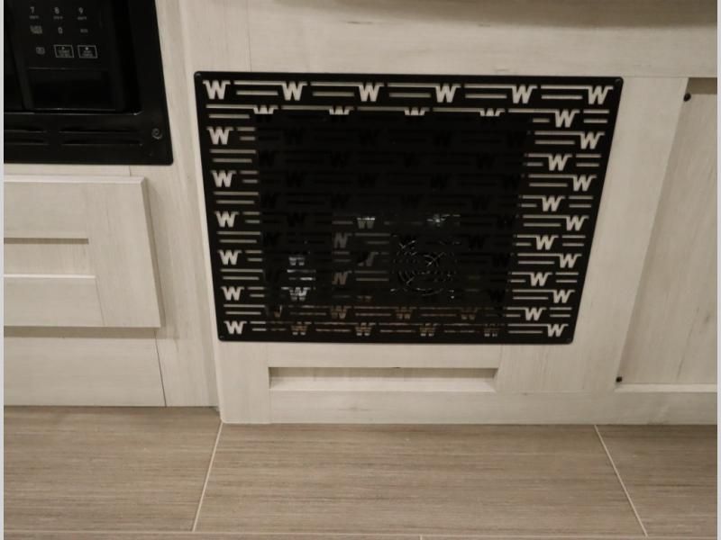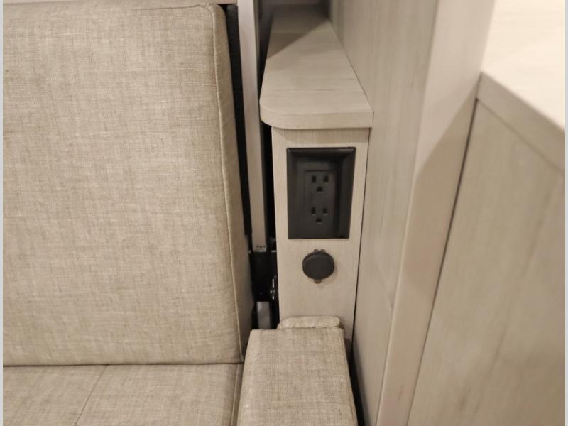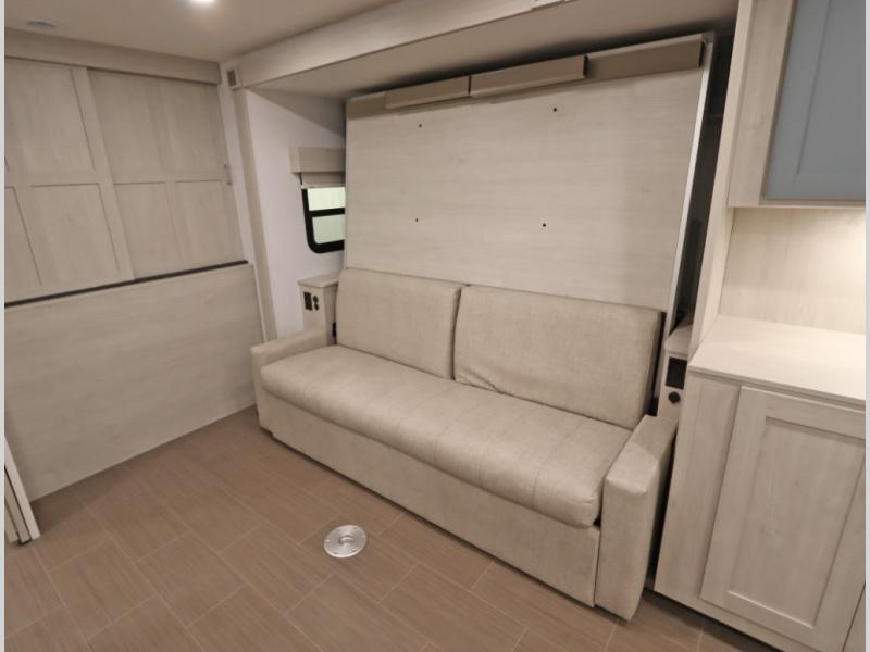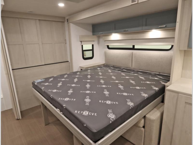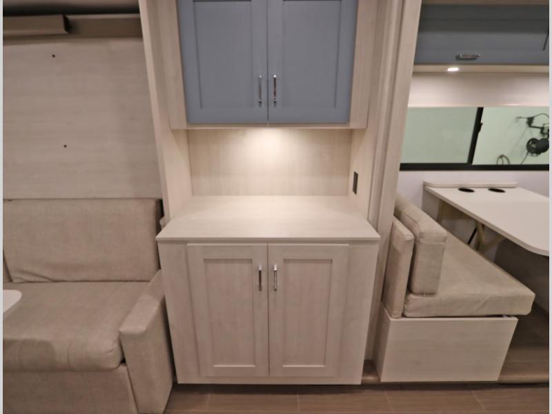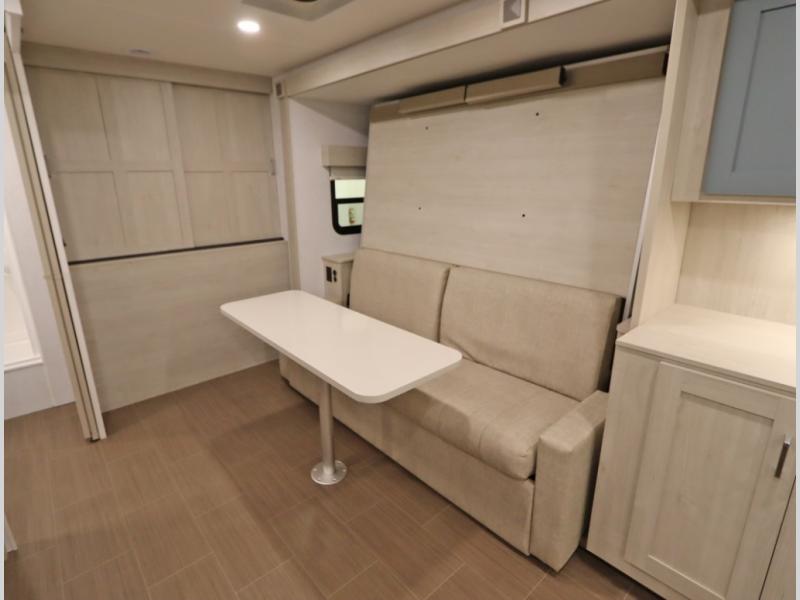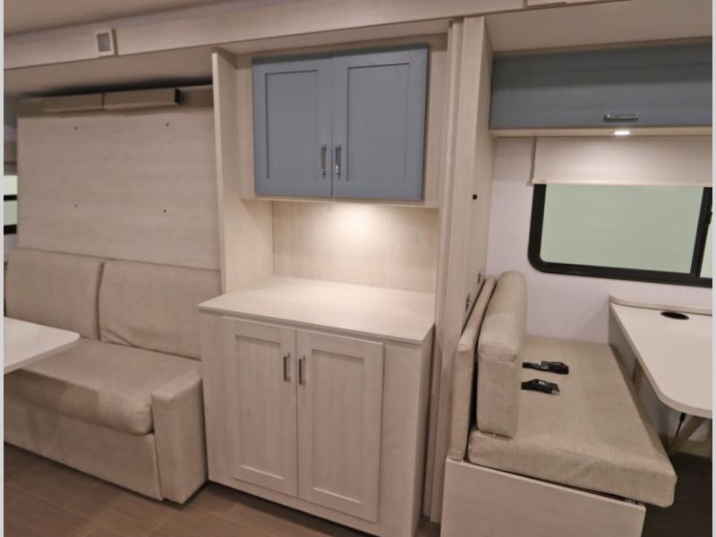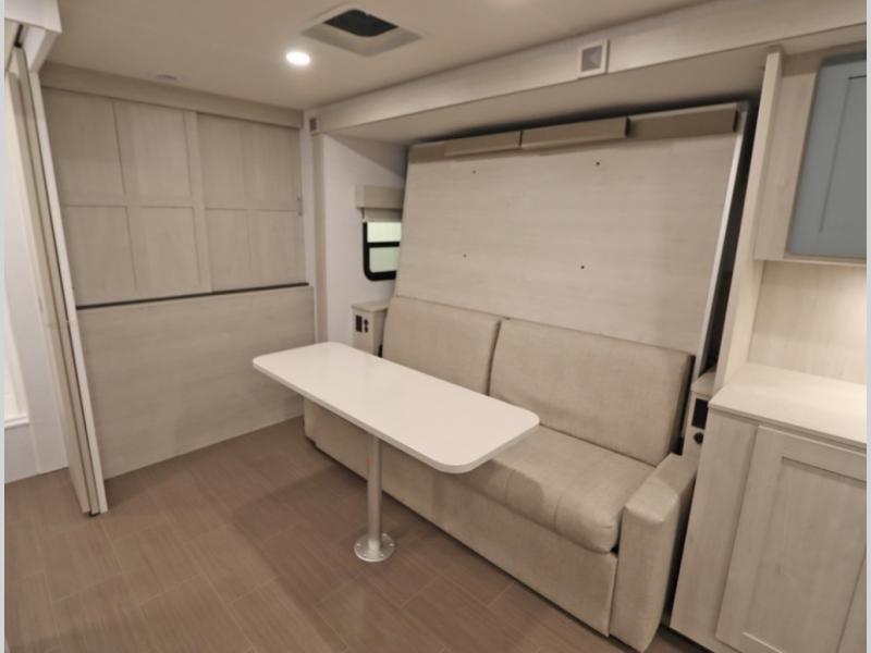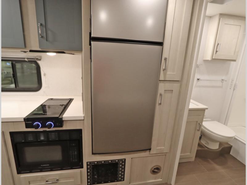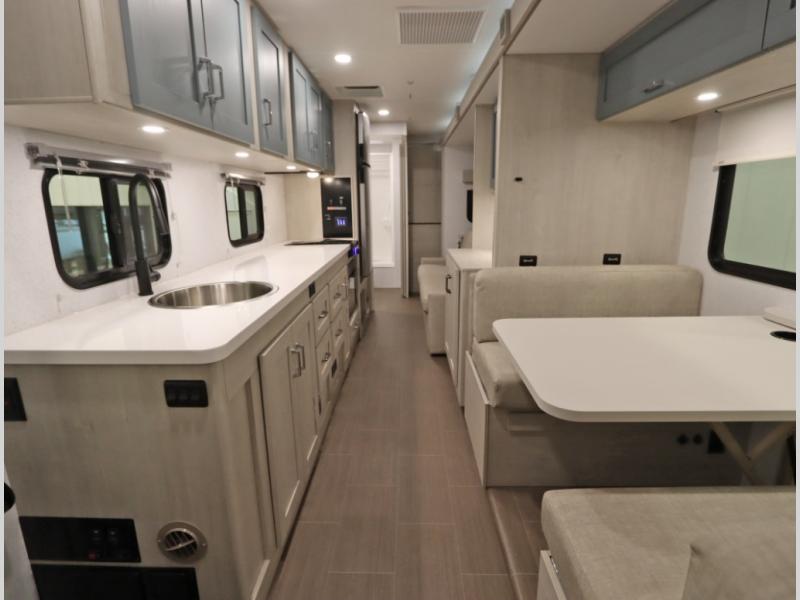 Convenient Amenities: The convection microwave with a built-in air fryer saves space, while flat floor designs enhance movement throughout the coach.