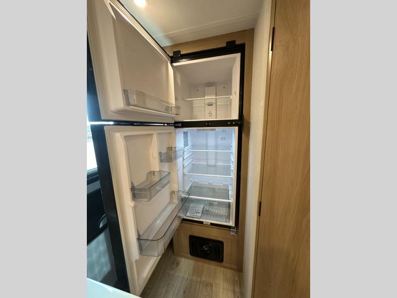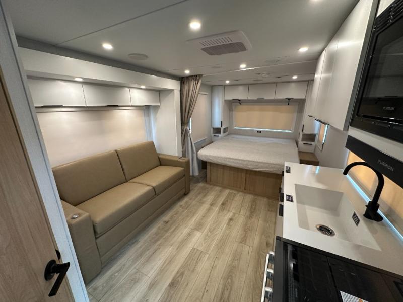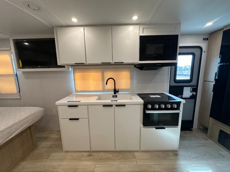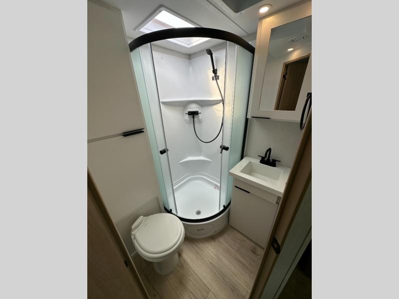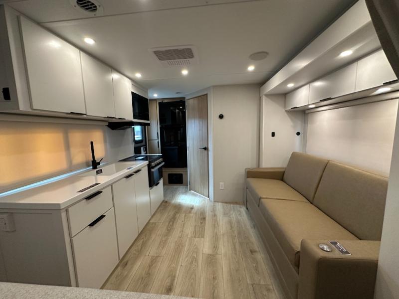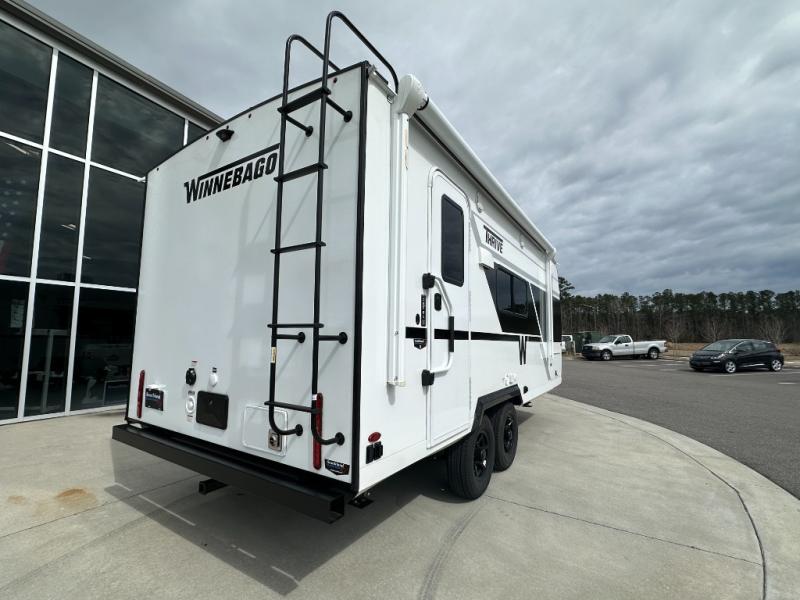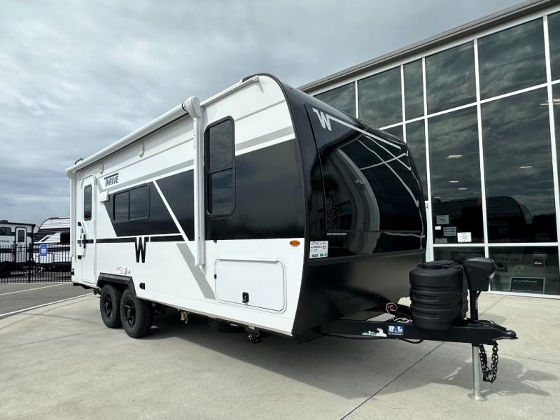 With any Thrive travel trailer by Winnebago, you can camp with functionality, comfort, and convenience! The large front viewing window will be the first thing that catches your eye, and the fiberglass sidewalls with Azdel Onboard provide a durable trailer made to last. There is also an exterior ladder, along with front radius profile lights, power stabilizer jacks, and a powered awning with LED lighting to name a few exterior features. You will stay powered up by the 30-amp power cord and 200-watt solar panel, plus there is a tankless water heater for endless hot showers. Inside, you'll love the custom Winnebago furniture, carpetless side outs, molded fiberglass countertops, and residential recessed ceiling lights to keep your space well lit!
