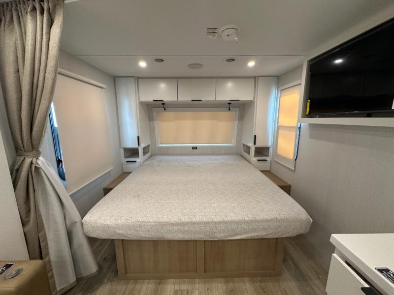 It will be so easy to enjoy camping trips in this compact travel trailer. The jack knife sofa slide provides more floor space plus a place for an overnight guest to sleep. You'll find an Olympic queen bed up front with a privacy curtain and dual bedroom wardrobes to keep your things tidy. A recessed three burner cooktop with an oven will let you make meals each day, and the 10.6 cu. ft. 12V refrigerator will keep your cold items fresh. There is also a pantry with pull-out shelves for added storage space. The full bath includes a power vent fan and a shower skylight that will give you more lighting and extra head room as you get ready each day!
