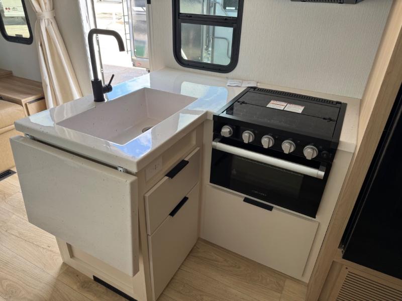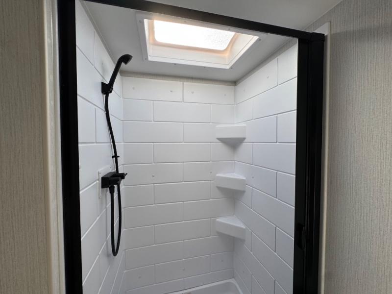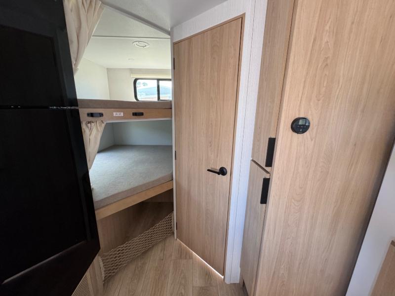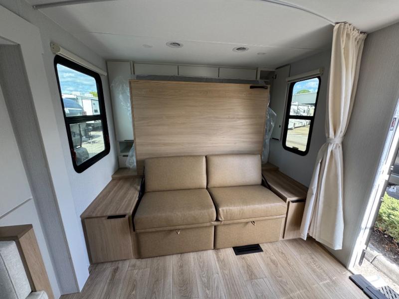 If you enjoy camping with a larger group, this travel trailer with double-size bunks is sure to be a fit! There is also a U-shaped dinette within a slide for more sleeping space, and you'll find the front king-size Murphy bed to be very versatile. A recessed three burner cooktop with an oven will let you make meals each day, and the 10.6 cu. ft. 12V refrigerator will keep your cold items fresh. There is also a countertop extension, giving you more space to prep meals. The full bath includes a power vent fan and a shower skylight that will give you additional lighting and extra head room as you get ready each day!