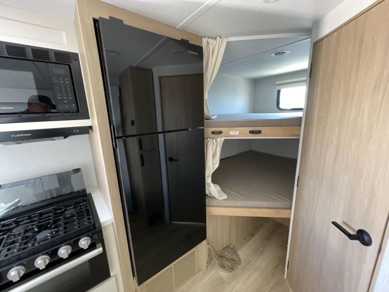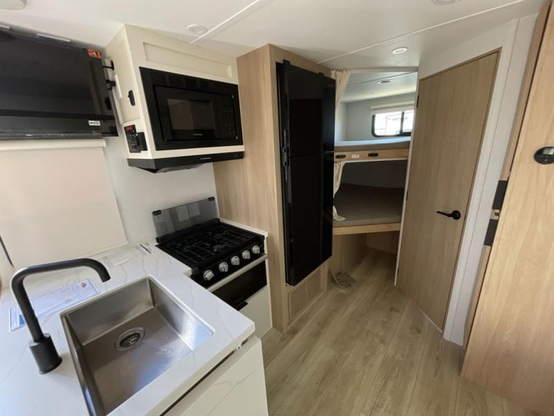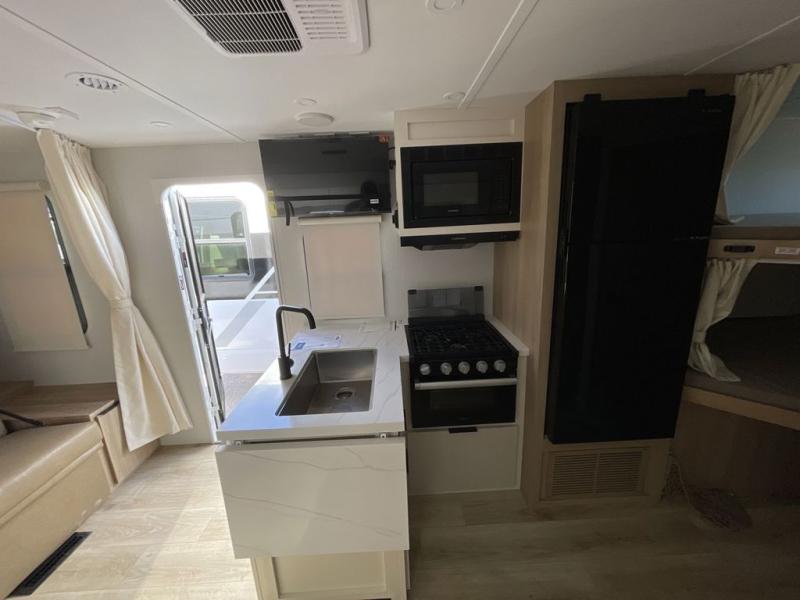 If you enjoy camping with a larger group, this travel trailer with double-size bunks is sure to be a fit! There is also a U-shaped dinette within a slide for more sleeping space, and you'll find the front Olympic Queen Murphy bed to be very versatile. A recessed three burner cooktop with an oven will let you make meals each day, and the 10.6 cu. ft. 12V refrigerator will keep your cold items fresh. There is also a countertop extension, giving you more space to prep meals. The full bath includes a power vent fan and a shower skylight that will give you additional lighting and extra head room as you get ready each day!