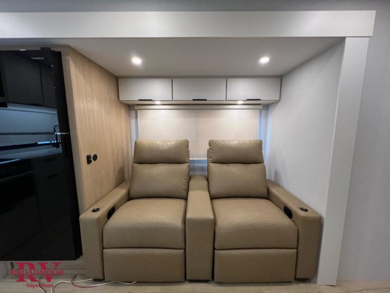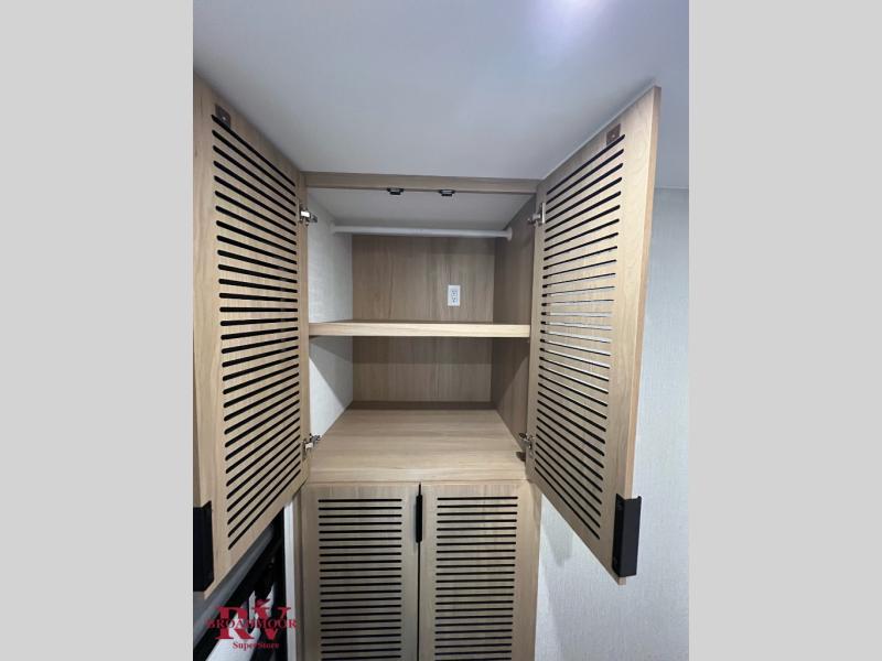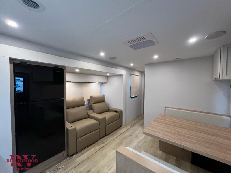This travel trailer provides both comfort and convenience. At the front, you'll find a private bedroom with its own exterior entry for added privacy and ease of access. The middle bathroom ensures convenient access from all areas and includes a wardrobe with washer and dryer prep. In the main living space, a spacious 42" x 82" Mega Dinette provides a great spot for meals, games, or work, while theater seating across from the TV allows for relaxing evenings. At the rear, the fully equipped kitchen includes a cooktop with oven, a refrigerator, and a pantry with pull-out shelves for maximum storage and organization. A second exterior exit from the kitchen area adds extra convenience, providing both a comfortable and functional trailer.