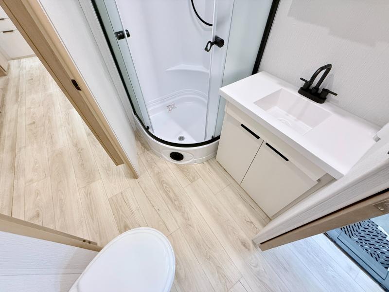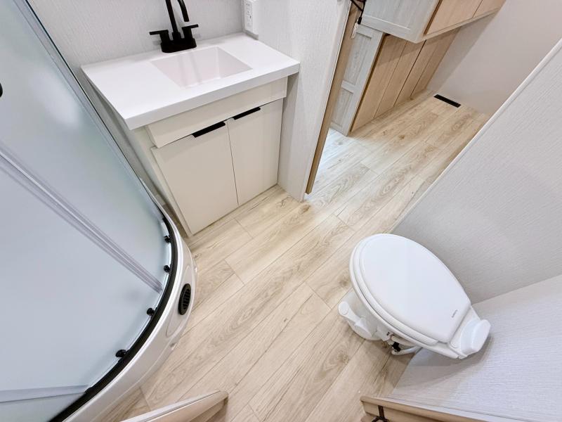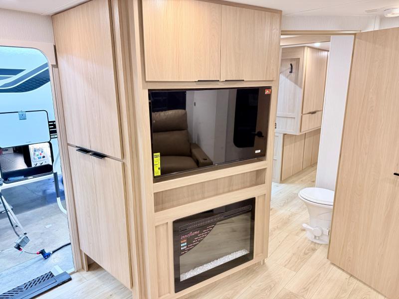 Have everything you need in a compact and well equipped travel trailer. After entering the travel trailer you will find neat places and storage to have everything in place. There is a galley kitchen with molded fiberglass countertops providing unmatched durability. When wanting a perfect place to relax you can enjoy watching TV in the booth dinette or enjoy movies just like at the theaters in the theater seating. If you want to have your own private space you will love the bedroom that has access to a conveniently placed bathroom with a modern radius shower. The bedroom also has a closet to store all your clothes and keep them wrinkle-free!