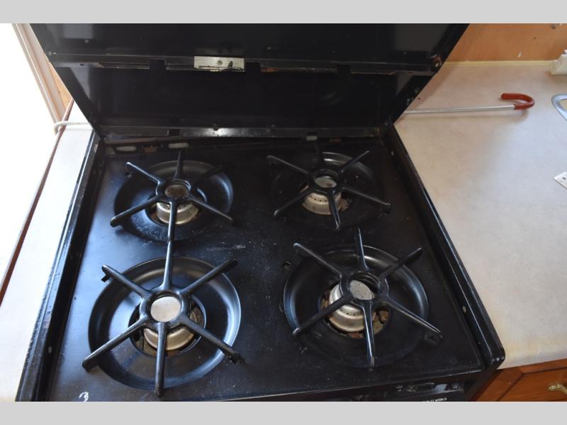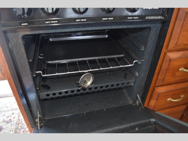 The fully equipped kitchen includes ample counter space, a stove, oven, refrigerator, and plenty of cabinet storage—perfect for preparing meals whether you’re on a weekend getaway or an extended trip. Opposite the kitchen, the dining area easily converts for additional sleeping if needed.