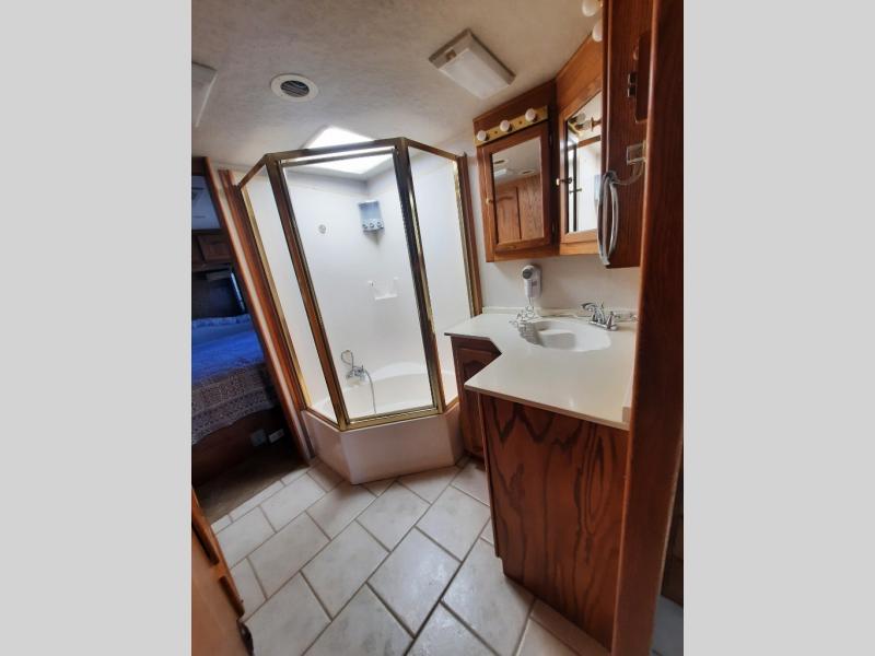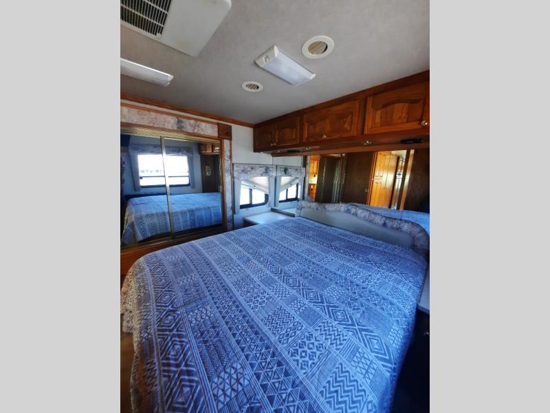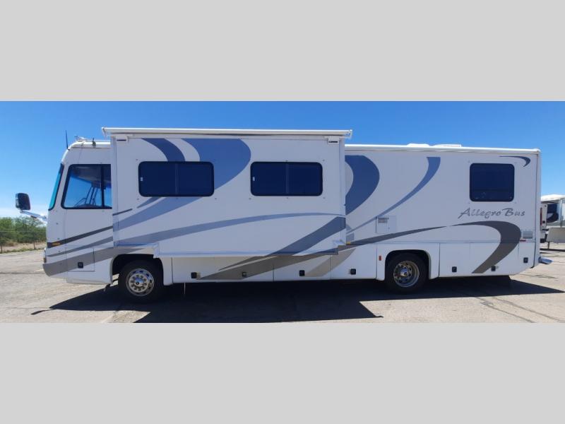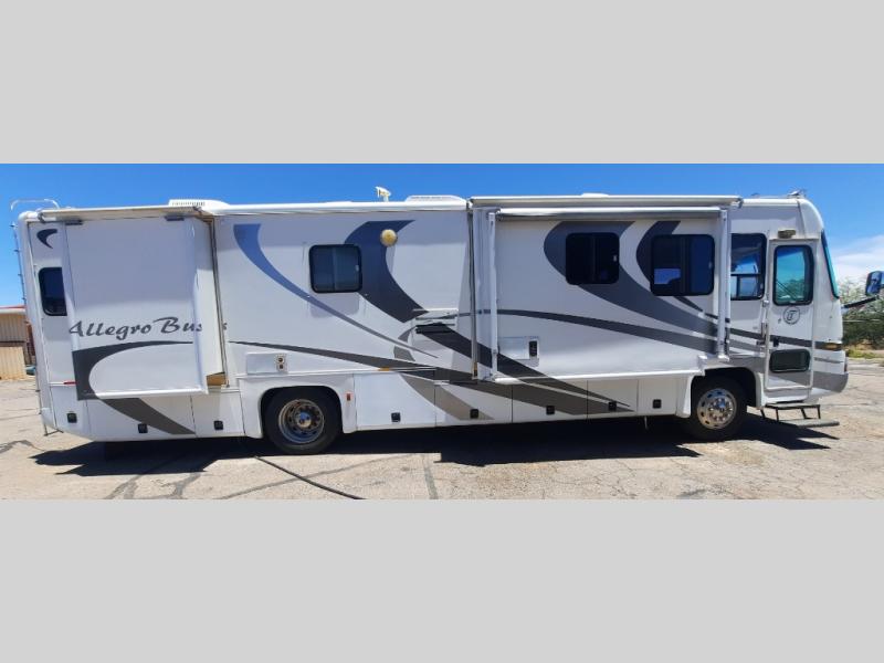 2001 Tiffin Allegro Bus 37TP with 104,464 miles, 7500 Onan diesel generator, 330 Cat engine with Allison 6 spd trans. 37 feet, 3 slides, 2a/c units, 2 heaters, dual zone controls, auto leveling system, air bags for suspension, hydraulic shocks, steering stabilizer. Water filtration system, reverse camera. Convection microwave, 3 burner stove, 4 door fridge, surround sound, queen size bed, jackknife sofa, dinette with bed, lots of storage.