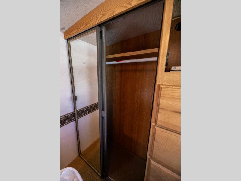 Bedroom: Private rear suite featuring a queen bed, wardrobe storage, and entertainment center.