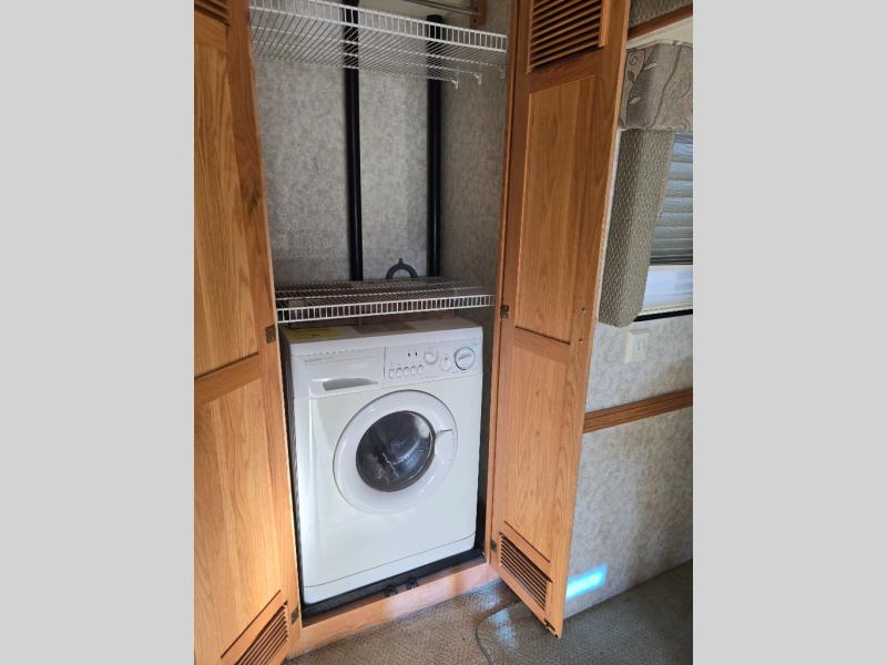 The exterior offers tons of pass-through basement storage, a rear folding metal carrier rack, exterior shower, rear black & white backup camera, double entry power step, drivers-side power window, electric and manual awnings, and a 12,000-lb 3-point trailer hitch with tow brake, making it ideal for towing and travel gear.