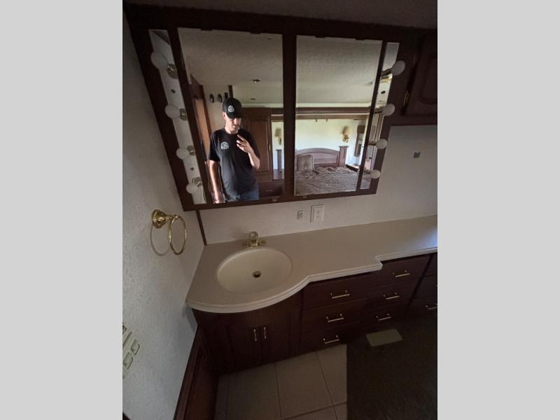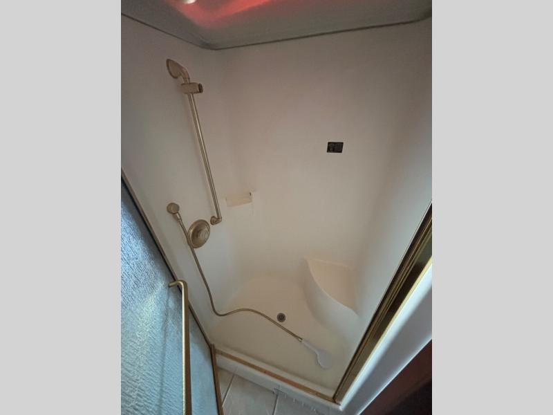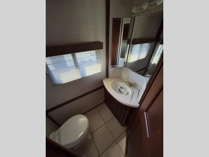 This coach features a bathroom complete with shower, toilet, and a sink with a medicine cabinet above for your convenience.