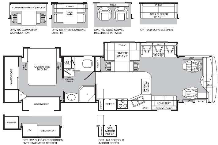 Quad Slide Discovery Motor Home w/Rear Queen Bed Slideout, Window Seat Slide w/Opt.Ent. Center, Ward./TV Cabinet, Nightstands, Lav., Angle Shower, Private Toilet Area, Utility Cab., Opt. Washer/Dryer, Pantry, Booth Dinette w/Table Extension & Chairs & Sofa Bed Slideout, Several Opts. Available for Dining & Sofa Area, Storage Above Cab Area, Loveseat/Double Kitchen Sink/Slideout Galley w/Storage/3 Burner Range/Refrigerator & Pantry Slide, Opt. 4 Door Refrigerator and More.