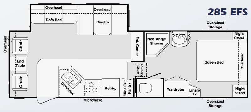 Keystone Cougar FW w/Rear Living Area Including: 2 Lounge Chairs & End Table w/Overhead Storage Cabinet, Slideout Sofa Bed & Booth Dinette w/Overhead Storage Above Both, Dbl. Kitchen Sink, 3 Burner Range, Refrig., Slideout Pantry, Ent. Center, Step Up to Bed & Bath w/Laundry Chute, Private Toilet Area, Neo-Angle Shower, Sink, Wardrobe, Front Queen Bed w/Nightstands Both Sides, Linen/TV, Overhead Storage and Much More!