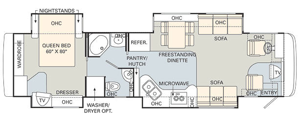 Quad Slide, Rear Queen Bed Slide w/Nightstands, Wardrobe w/Washer/Dryer Opt., TV, Dresser, Shower, Vanity w/Overhead Cab., Seperate Stool Room w/Vanity, Refrigerator, Pantry/Hutch, Double Kitchen Sink, 2 Burner Range w/Microwave, Dinette w/Chairs, 2 Sofas, TV Over Cab and More.