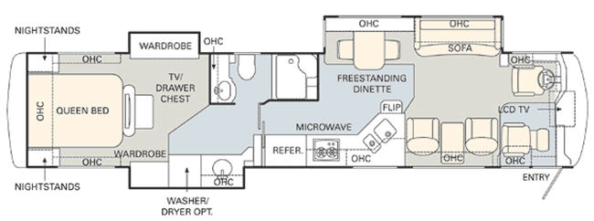 Triple Slide, Rear Queen Bed w/Nightstands, TV/Drawer Chest, Slideout Wardrobe, Wash/Dryer Opt. Lav. & Counter Space, Shower, Refrigerator, 2 Burner Cooktop w/Micro., Double Sink, Flip Counter Extension, Free-Standing Dinette w/Chairs, Sofa, 2 Swivel Rockers, TV Above Cab Area & More.