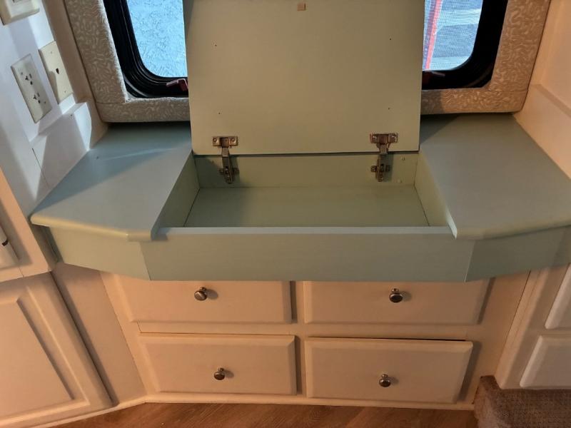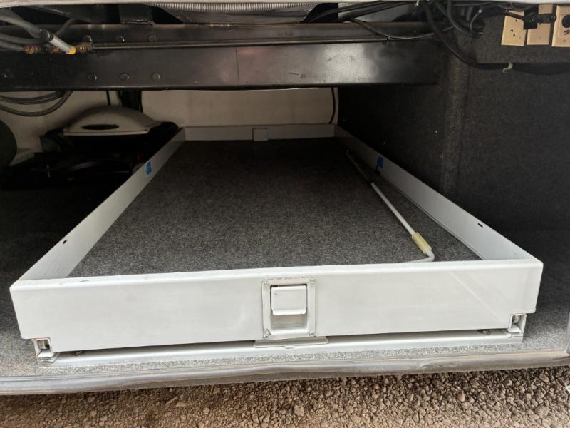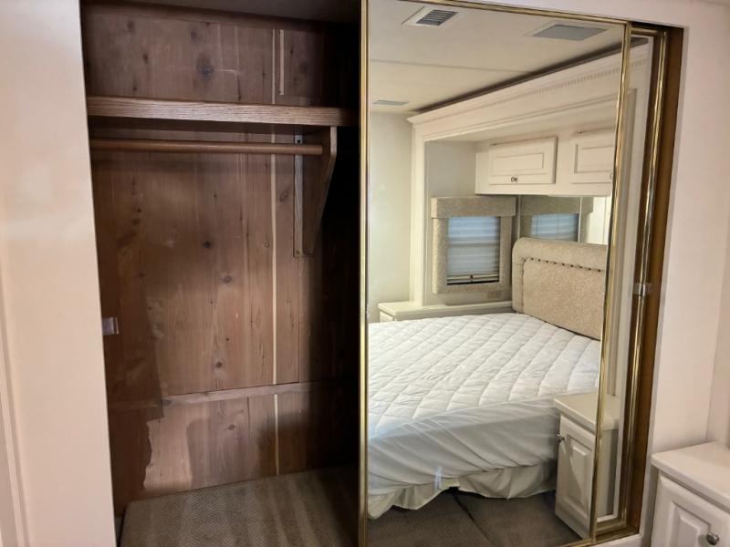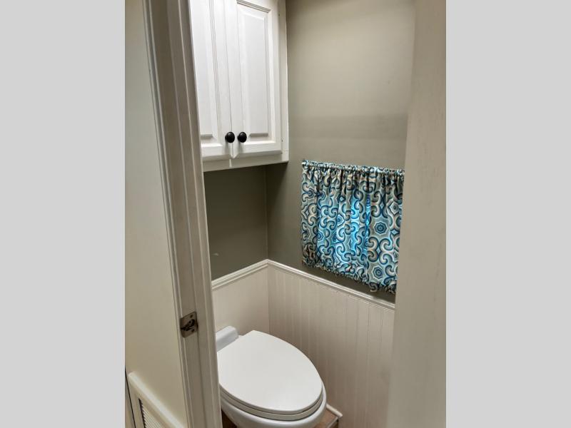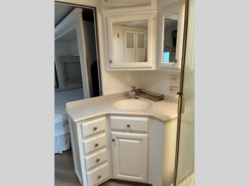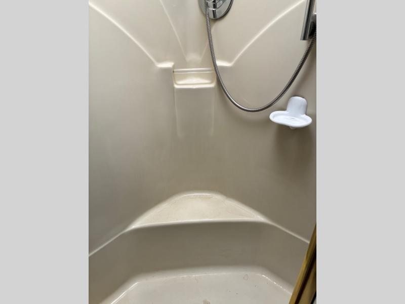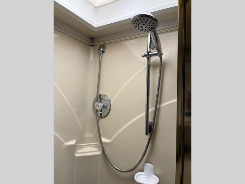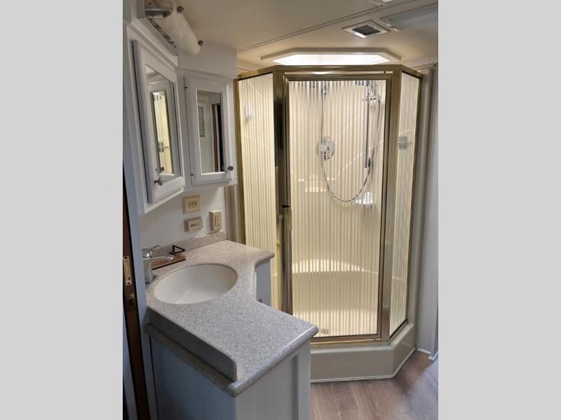 This coach features a bathroom complete with large sit down shower, toilet, and a sink with a medicine cabinet above for your convenience.
