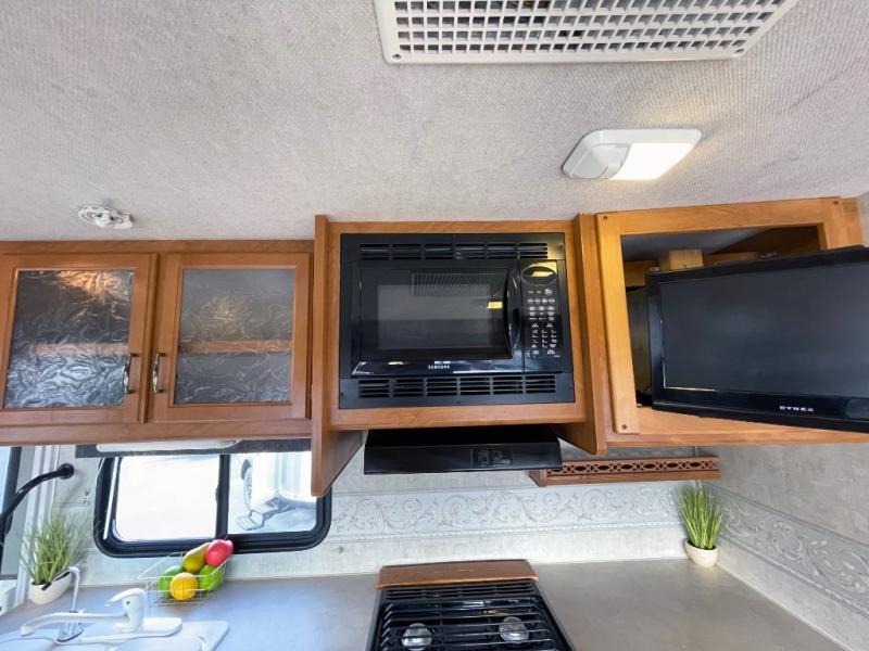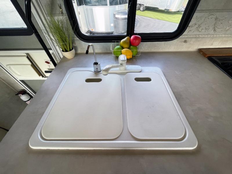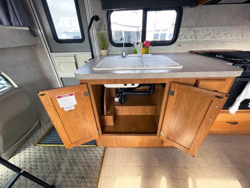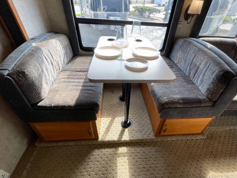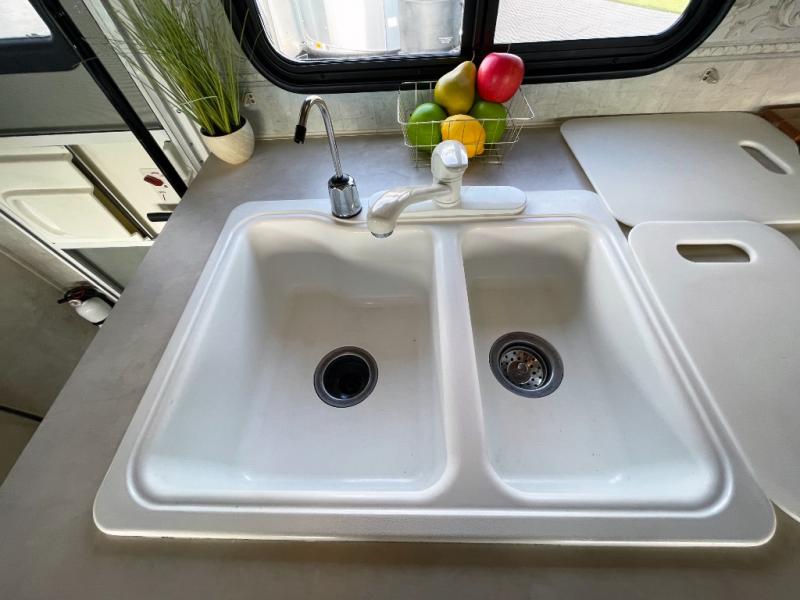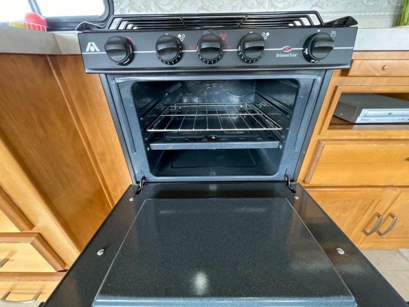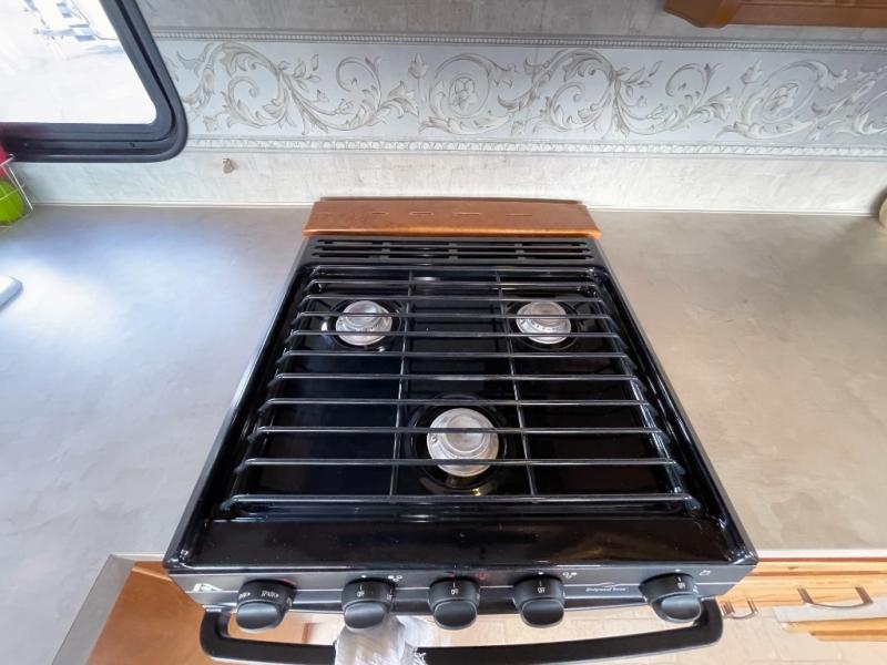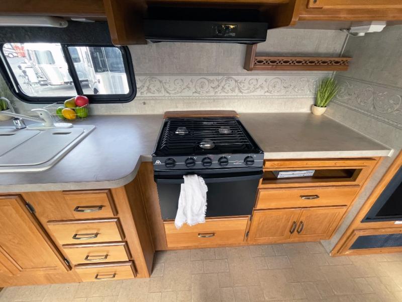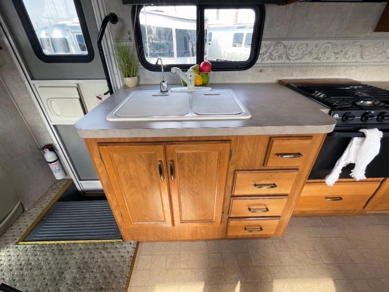 Inside, the single slide-out expands the living space, creating a roomy lounge area complete with a convertible sofa, dinette, and overhead storage. The kitchen features a three-burner range, microwave, double-basin sink, and large refrigerator—perfect for preparing meals on the road.