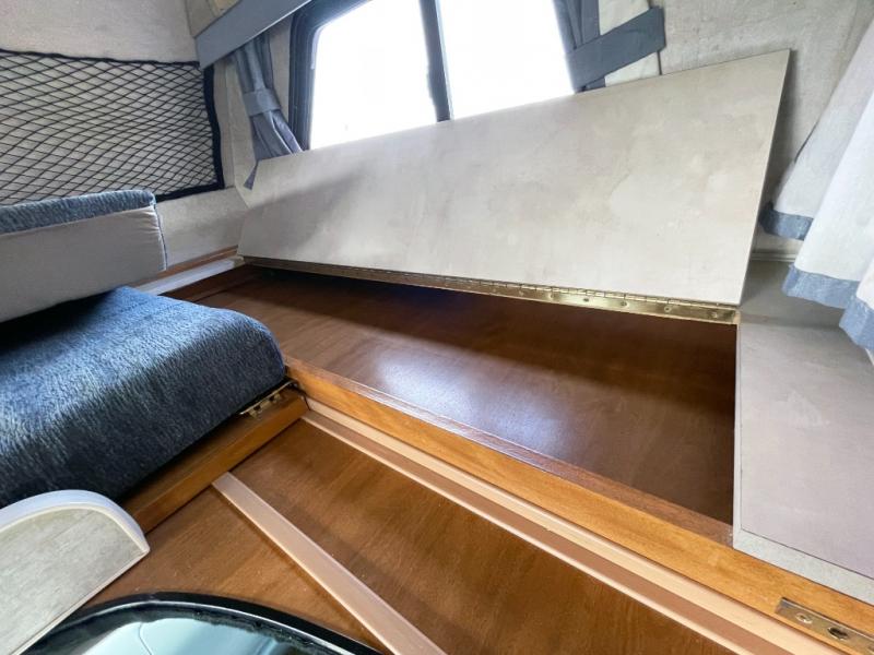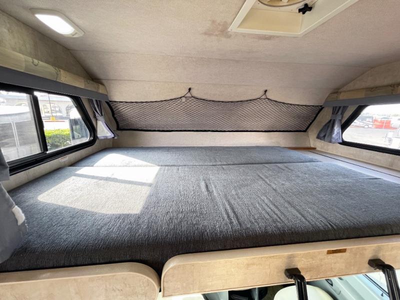 The rear bedroom includes a walk-around queen bed with dual wardrobes, while the bathroom provides a full shower, vanity, and separate toilet area. Overhead in the cab, a spacious bunk offers additional sleeping quarters, making this coach capable of sleeping up to 8 passengers.