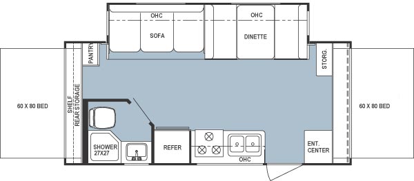 Rear Storage, Pantry, Shower, Refrigerator, Sofa, Dinette, Stove, Double, Ktichen Sink, Entertainment Center, Overhead Storage, Two Full Beds and Much More!