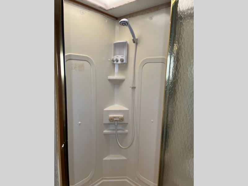 Double Slide, Rear Kitchen Slideout w/Pantry, Refrigerator, Microwave & 3 Burner Range, Double Kitchen Sink, Rear Living Area w/Desk, Booth Dinette/J-Steel Sofa Slideout, Lounge Chair, Ent. Center & Closet, Stool Room, Wardrobe, Angle Shower, Lav., Medicine Cabinet, Front Queen Bed w/Wardrobes & TV Shelf, Overhead Cabinets Throughout, and Much More!