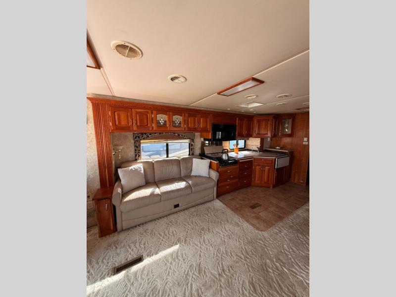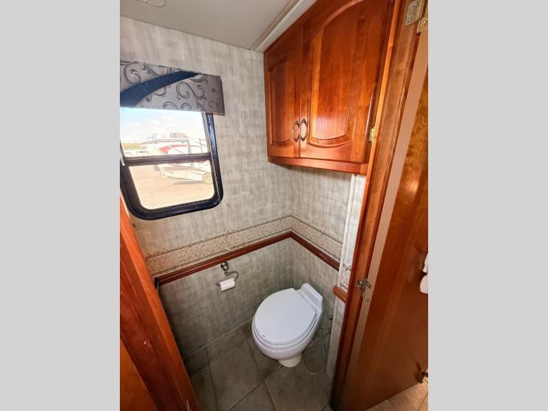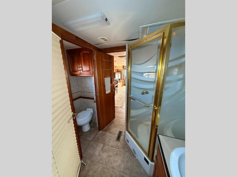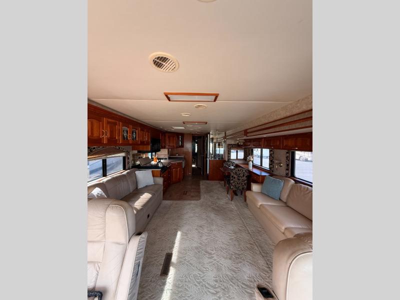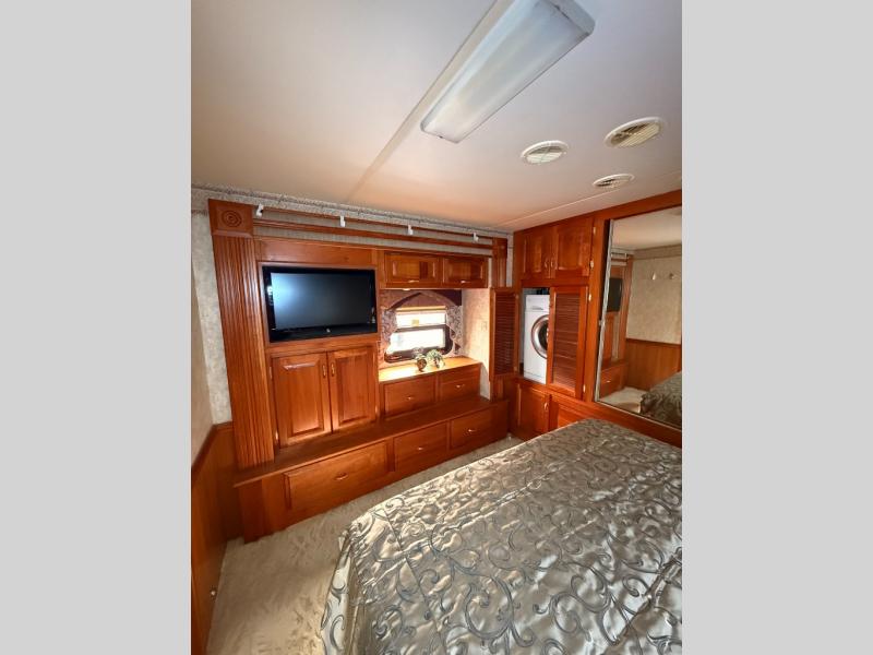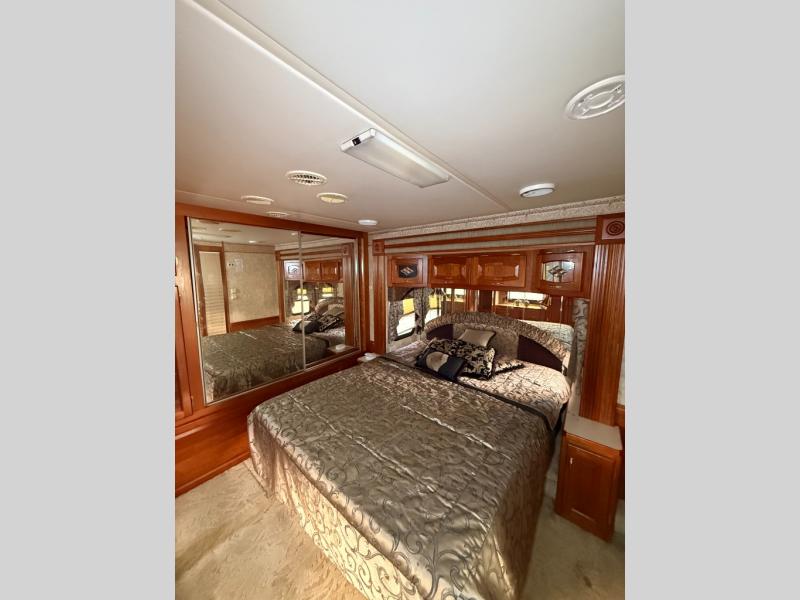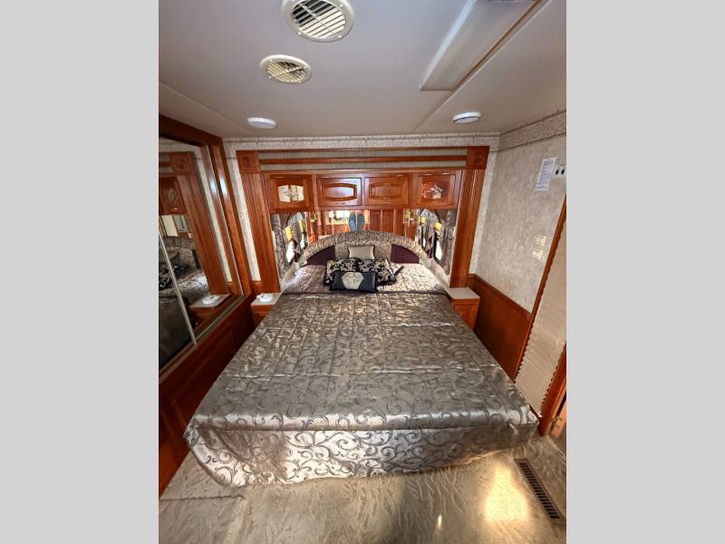 Quad Slide, Rear Side Queen Bed Slide, Overhead Cab., Chest of Drawers & TV/Storage Slideout, Wash/Dryer, Wardrobe w/Mirrored Doors, Angle Shower, Lav., Seperate Stool Room w/Lav., Refrigerator, Pantry, Dinette w/4 Chairs & Sofa Slide, 2nd Sofa, TV Above Cab Area, 3 Burner Range, Sink & More.