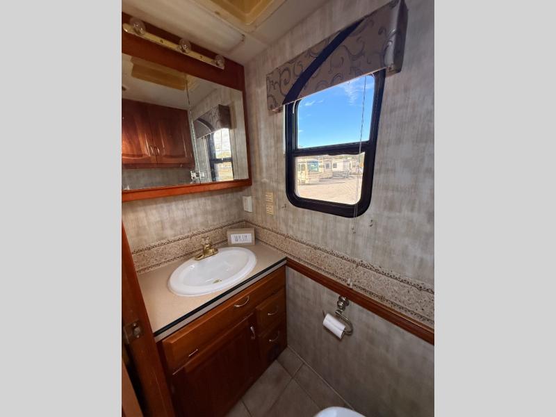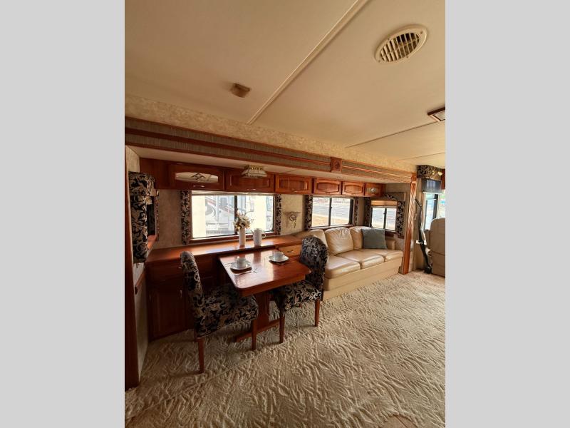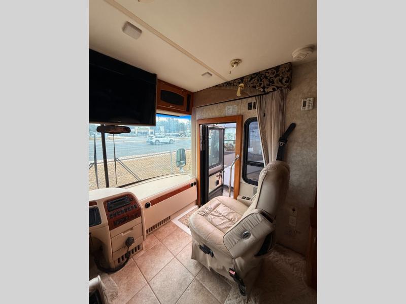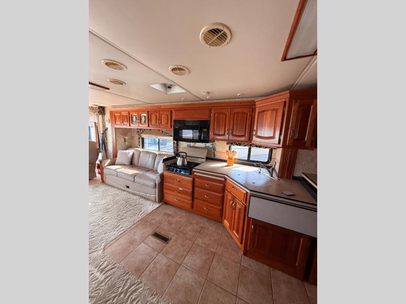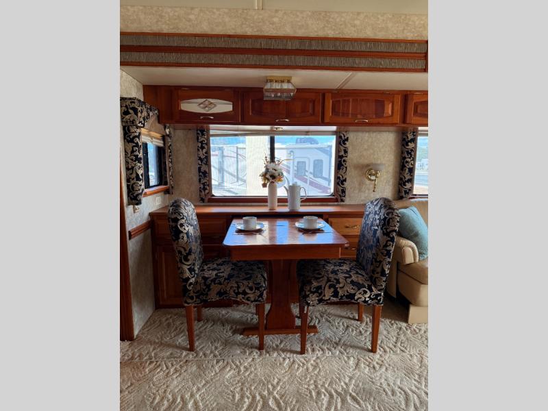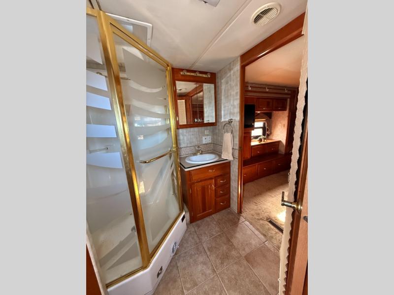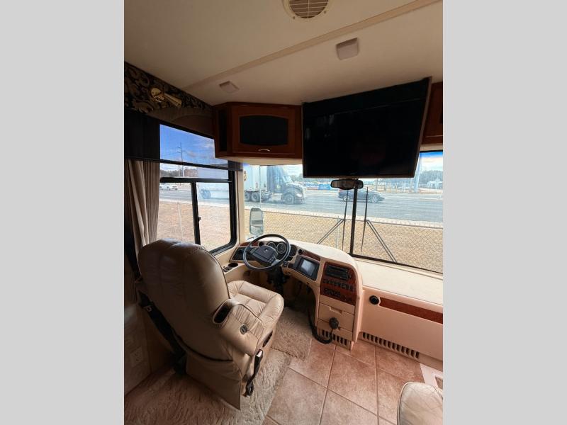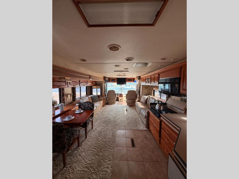 Quad Slide, Rear Side Queen Bed Slide, Overhead Cab., Chest of Drawers & TV/Storage Slideout, Wash/Dryer, Wardrobe w/Mirrored Doors, Angle Shower, Lav., Seperate Stool Room w/Lav., Refrigerator, Pantry, Dinette w/4 Chairs & Sofa Slide, 2nd Sofa, TV Above Cab Area, 3 Burner Range, Sink & More.