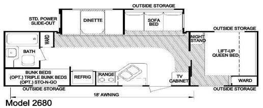Single Slide Out, Rear Bathroom, Toliet, Tub, Sink, Rear Bunk Beds, Refrigerator, 3 Burner Range, Double Kitchen Sink, Slide Out Booth Dinette & Sofa Bed, TV Cabinet, Front Bedroom, Nightstand, Wardrobe, Lift-Up Queen Bed, Outside Storage, and More.