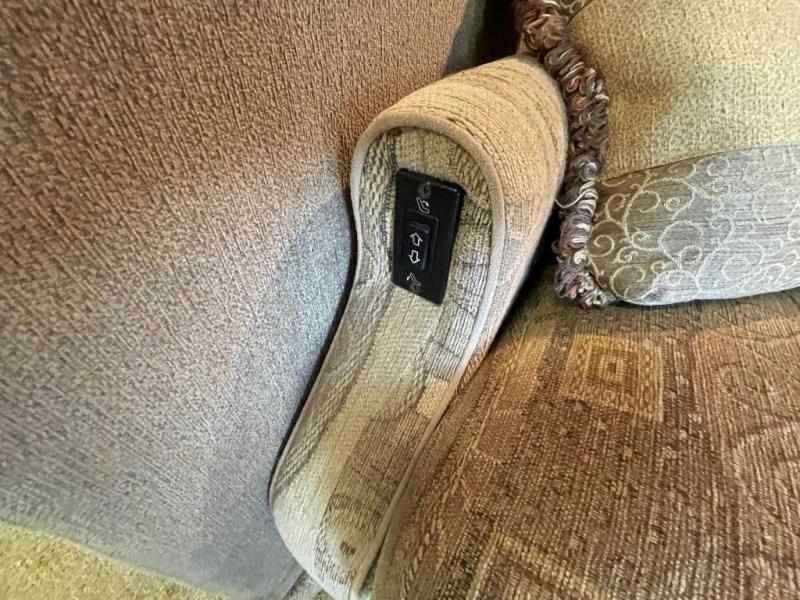 Step inside and you’re greeted by a spacious layout featuring a Rest Easy power sofa, a comfortable recliner, and a full dinette—giving you plenty of relaxing and dining options. The kitchen includes a 3-burner stove, refrigerator, microwave, and ample countertop space to make meals feel effortless.