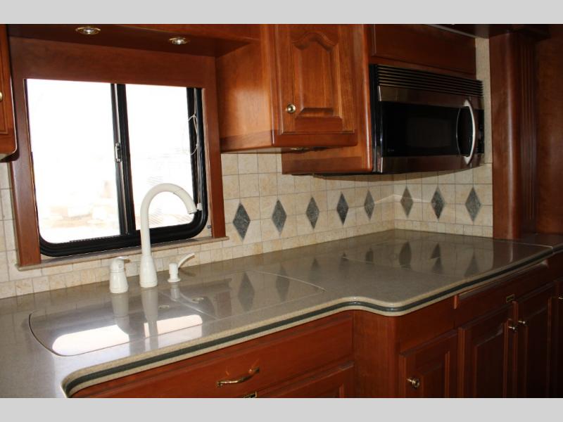 - Solid-surface countertops with plenty of prep space and a deep, stainless steel sink for convenience.