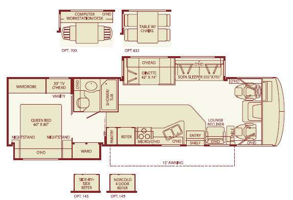 Double Slide Fleetwood Bounder Class A Rear Bedroom, Wardrobe, 20" TV Overhead, Slide Out Queen Bed w/Nightstands/Wardrobe, Shower, Sink, Toilet, Pantry, Refrigerator, 3 Burner Range, Double Kitchen Sink, Lounge Recliner, Slide Out Booth Dinette/Sofa Sleeper, Storage, Overhead Cabinet, and More.