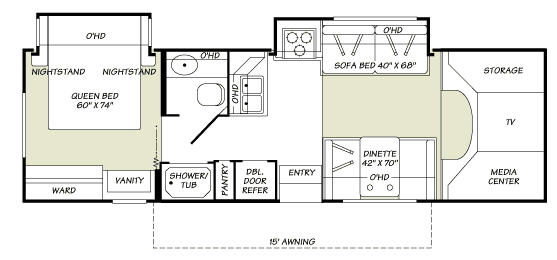 Double Slide, Rear Queen Bed Slideout w/Nightstands, Wardrobe, Vanity, Shower/Tub, Separate Stool Room w/Lav., Pantry, Refrigerator, 3 Burner Range & Sofa Bed Slideout, Booth Dinette, Storage/TV/Media Center Above Cab Area & More.