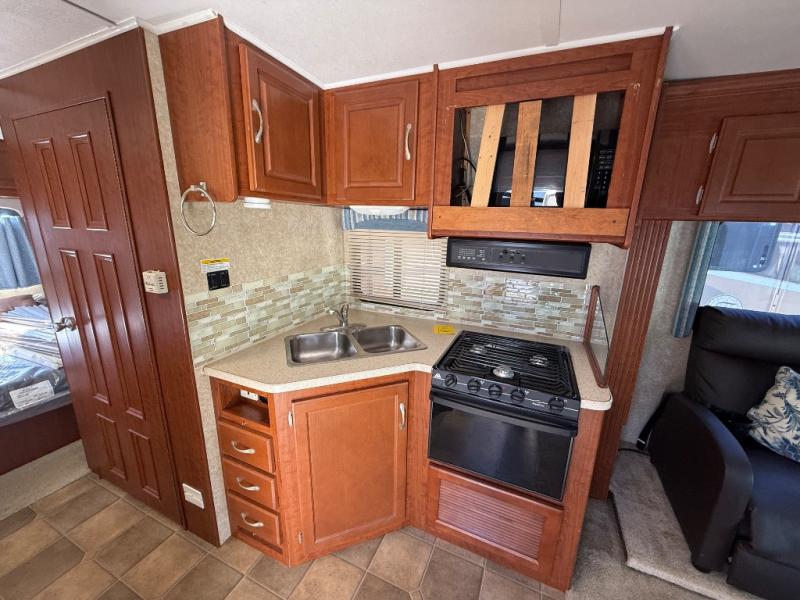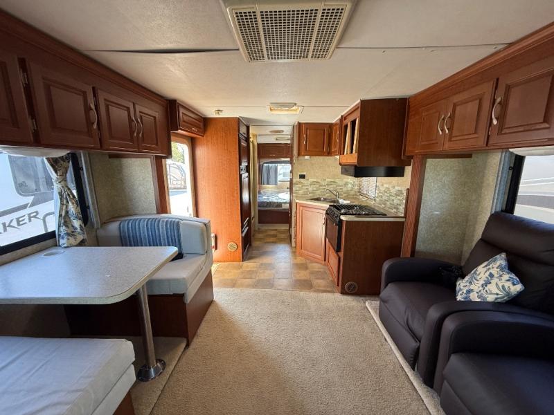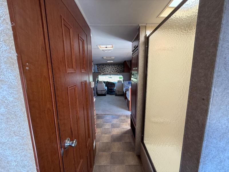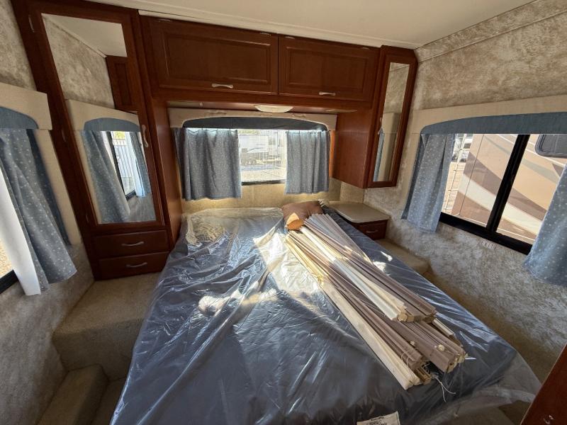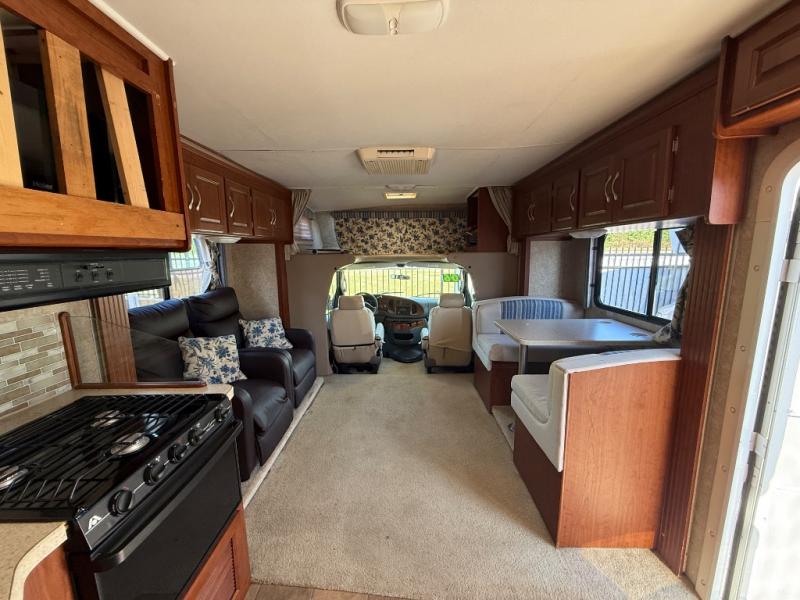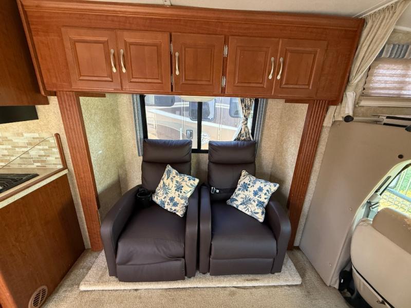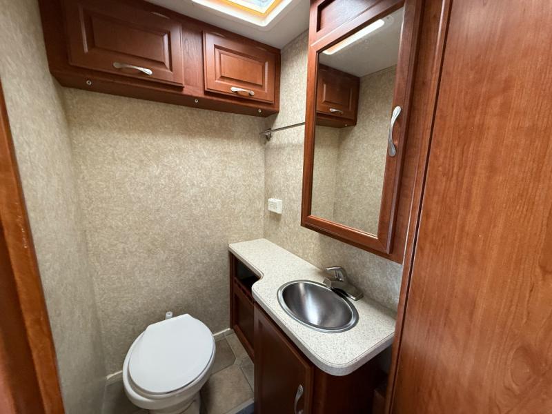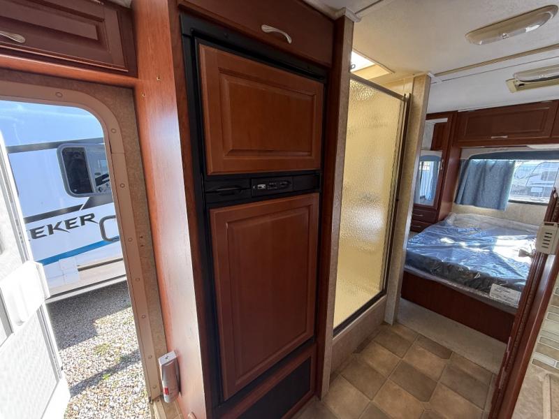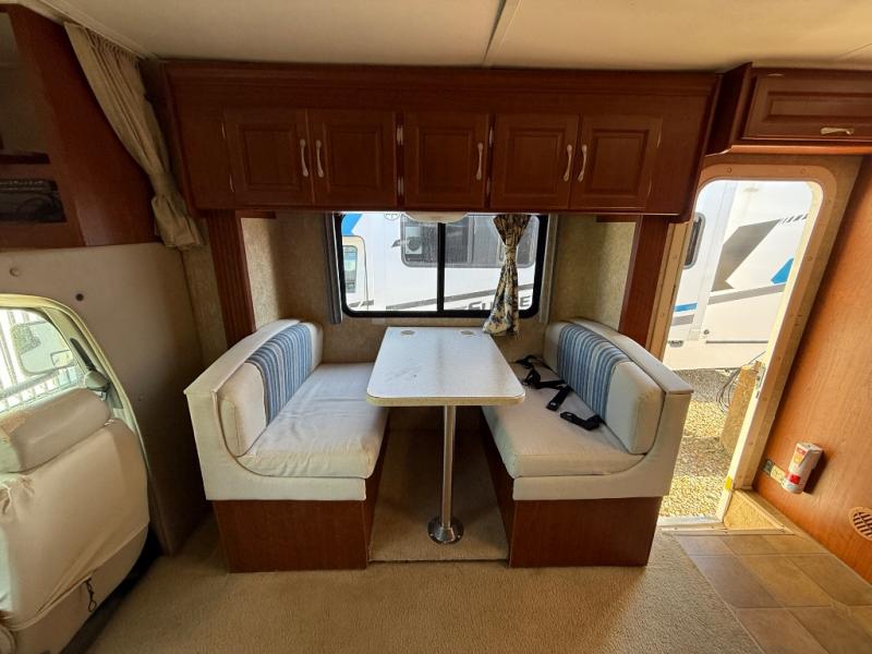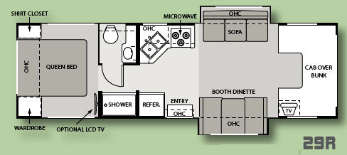 Double Slide, Rear Queen Bed w/Shirt Closet & Wardrobe, Opt. LCD TV, Shower, Private Toilet Area w/Lav., Refrigerator, Slideout Booth Dinette w/Slideout Sofa Opposite, 3 Burner Range w/Microwave, Double Kitchen Sink, Plenty of Overhead Storage Cabinets, Cabover Bunk w/TV Above and More. Available w/Diesel Engine and Chevy Chassis Choice. Ford Specifications Shown For Gas Engine.