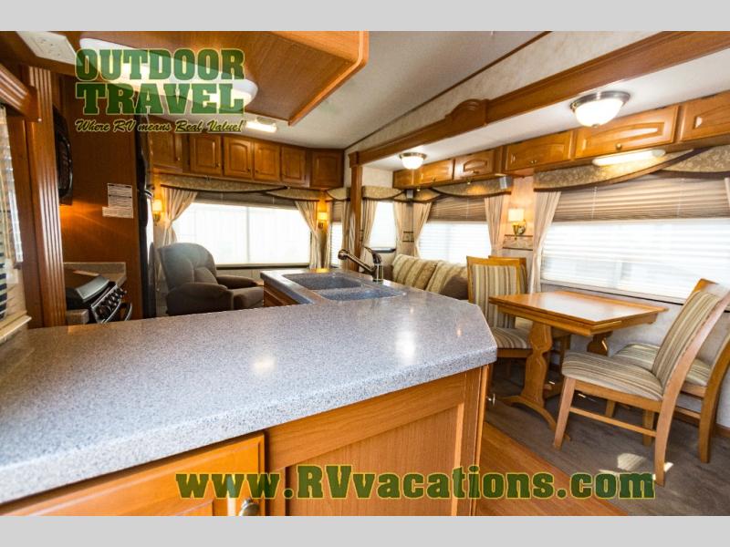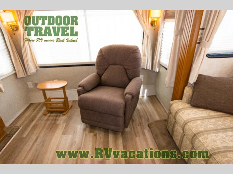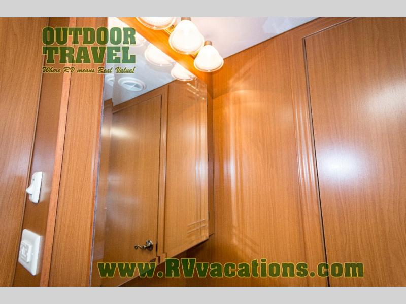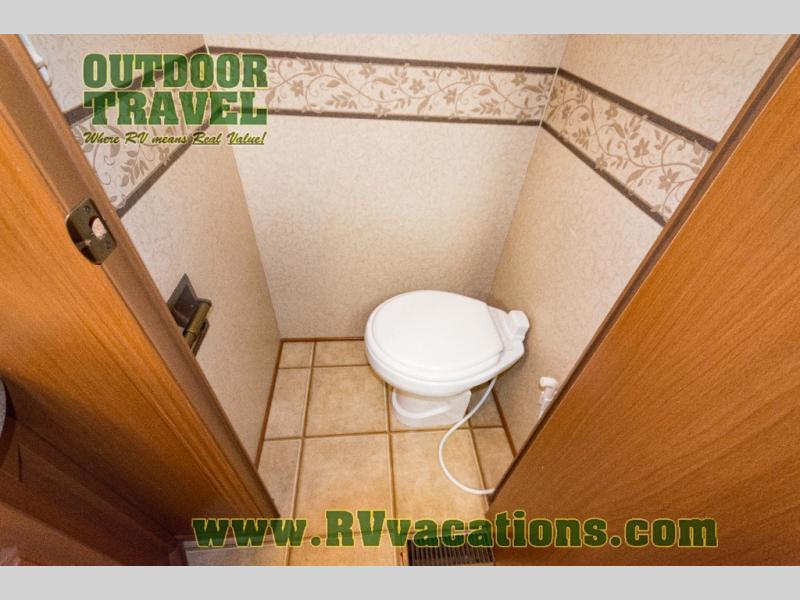 The interior is equipped with a DVD/CD 5.1 surround sound entertainment system, Corian-look countertops, a porcelain toilet, day-night shades, and a skylight above the shower.