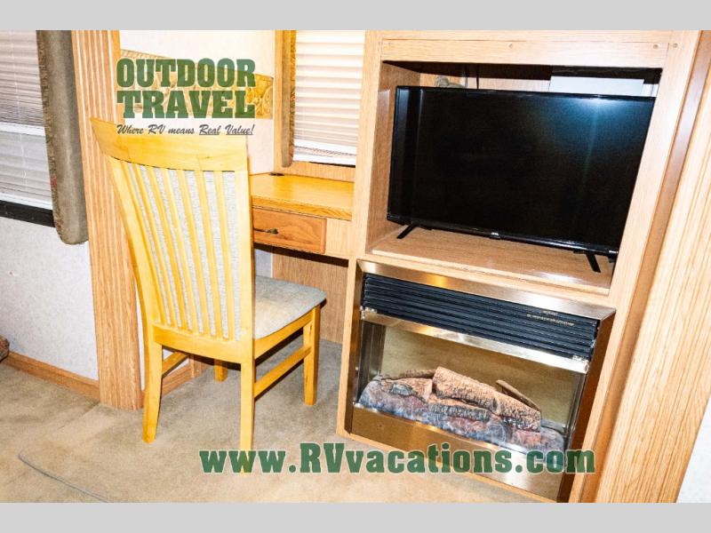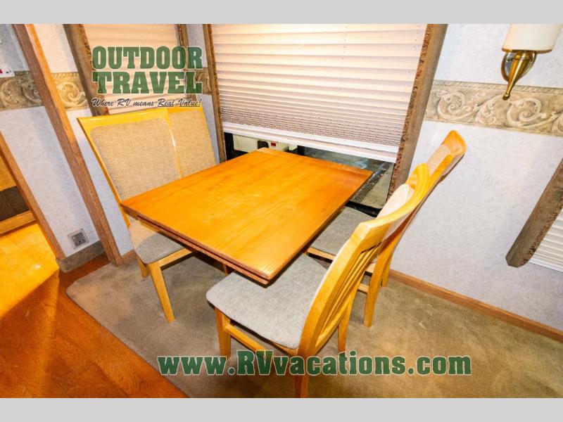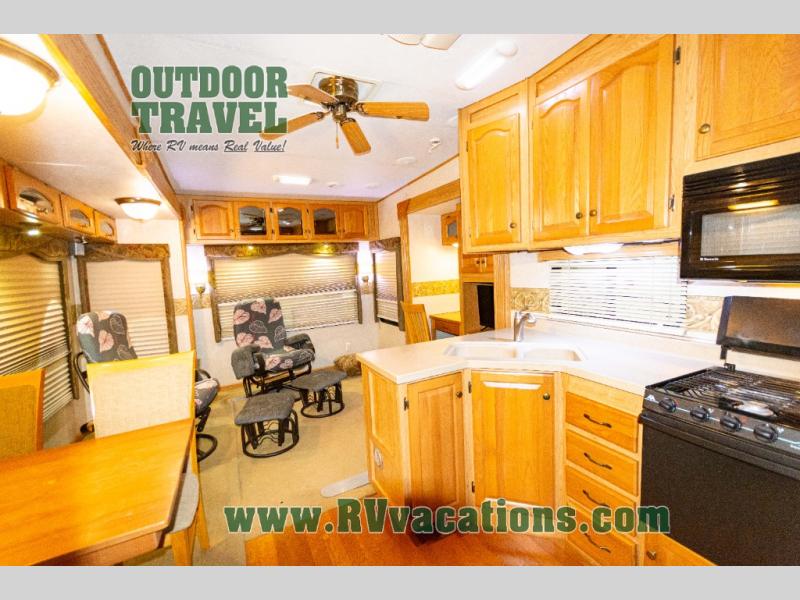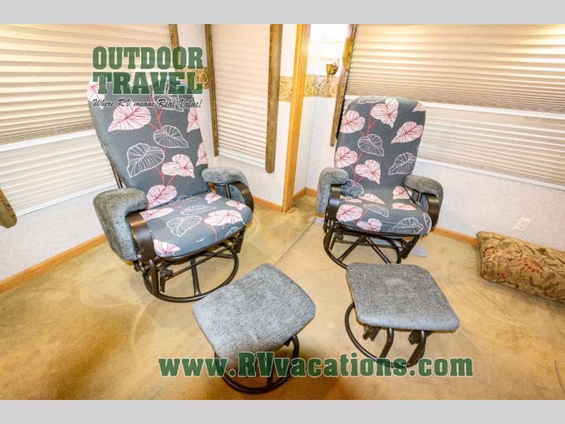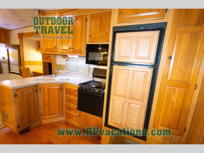 Triple Slide Fifth Wheel, Rear Living w/Two Recliners, Slide Out Ent. Center, Slide Out Sofa Bed/Freestanding Dinette, Double Kitchen Sink, 3 Burner Range, Refrigerator, Pantry, Closet, King Shower, Sink, Private Toilet Area, TV Cabinet/Washer Dryer Ready, Slide Out Wardrobe, Queen Bed w/4 Drawer Under Bed Storage, Nightstands, and More.