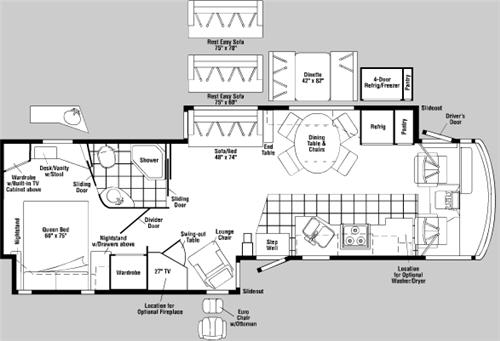 Double Slide, Queen Bed, Nightstands w/Drawers Above One Side, Wardrobe w/Built-In TV Cabinet Above, Desk/Vanity w/Stool, Angle Shower, Ent. Center w/27 In. TV, Lounge Chair, Sofa Bed or Rest Easy Sofa, End Table, Dining Table & Chairs, Kitchen Sink, 3 Burner Range, Pantry, Refrigerator, and More.